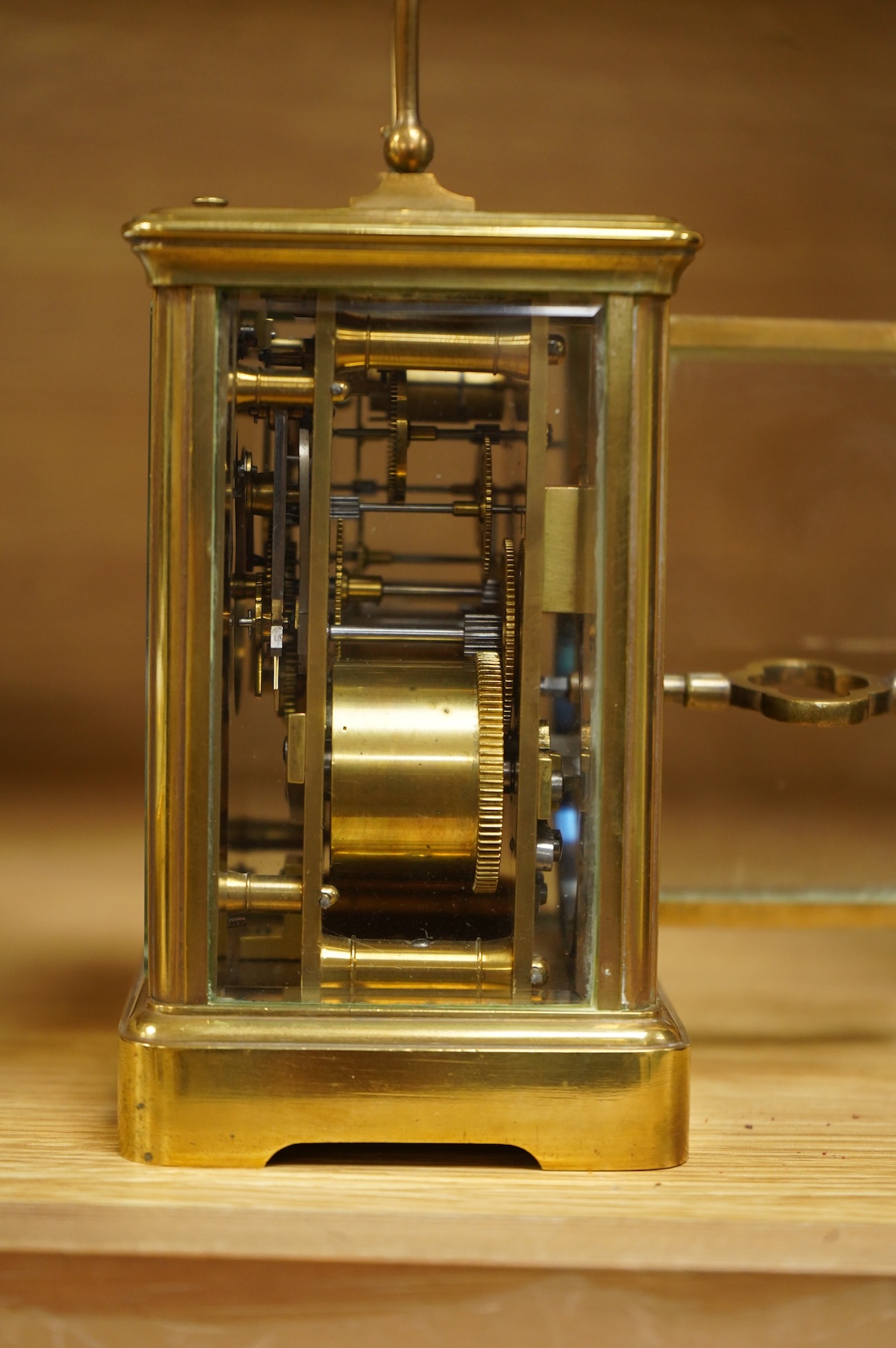 A French brass carriage clock with gong-striking movement, with key, in original leather case