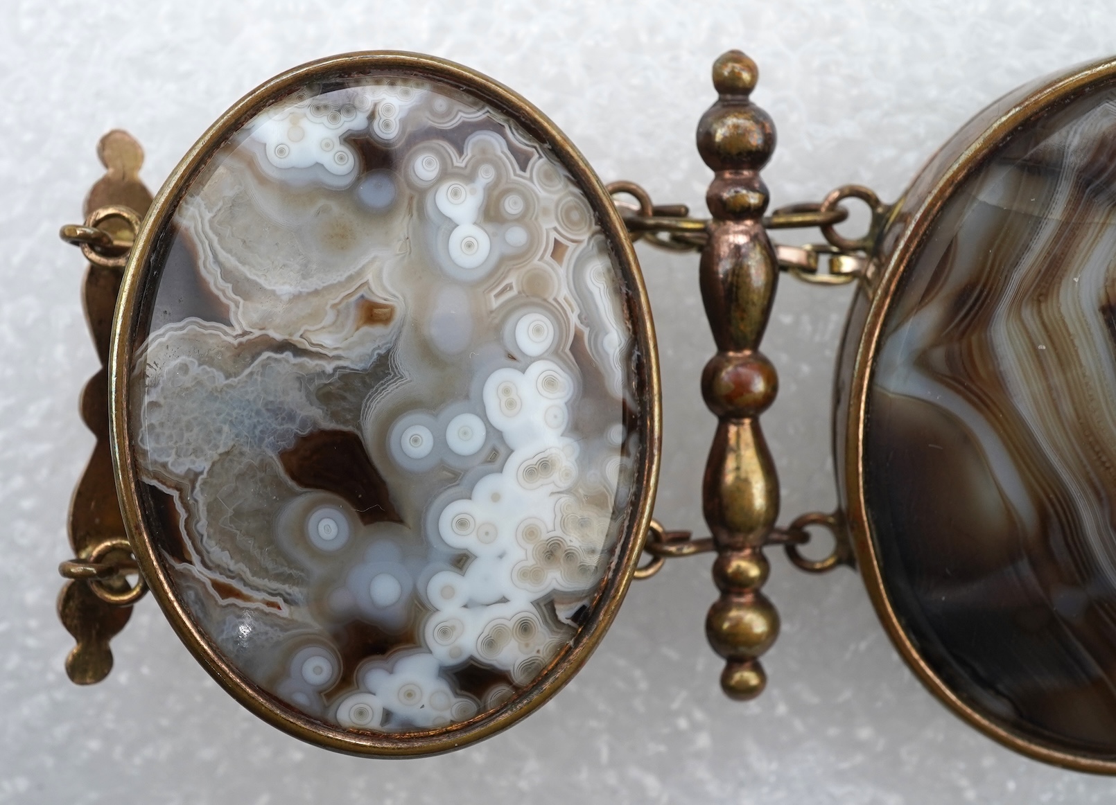 An agate bracelet, circa 1900, composed of oval panels of polished agate, mounted in gilt metal, length approximately 20cm