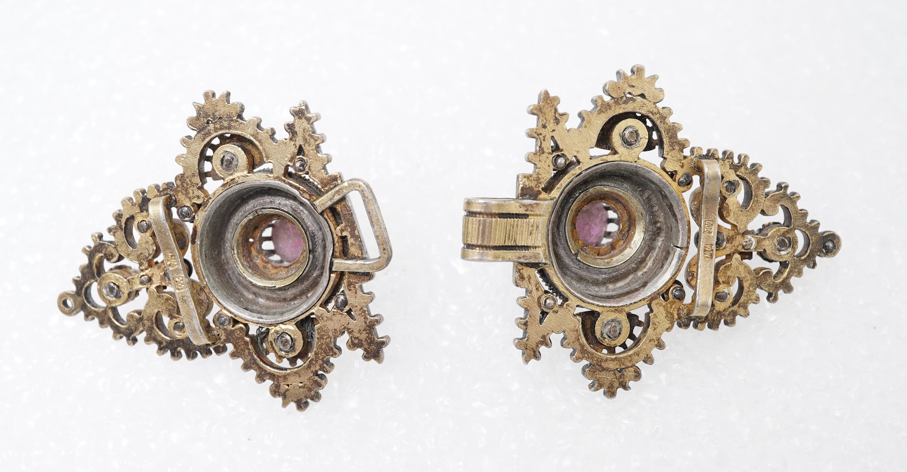 An enamel and garnet buckle, late 19th century, each half composed of elaborate scrollwork and applied with multicoloured enamel, centring on circular-cut garnets and accented with seed pearls, mounted in gilt silver, combined length 7.5cm, stamped 900, maker's mark MM