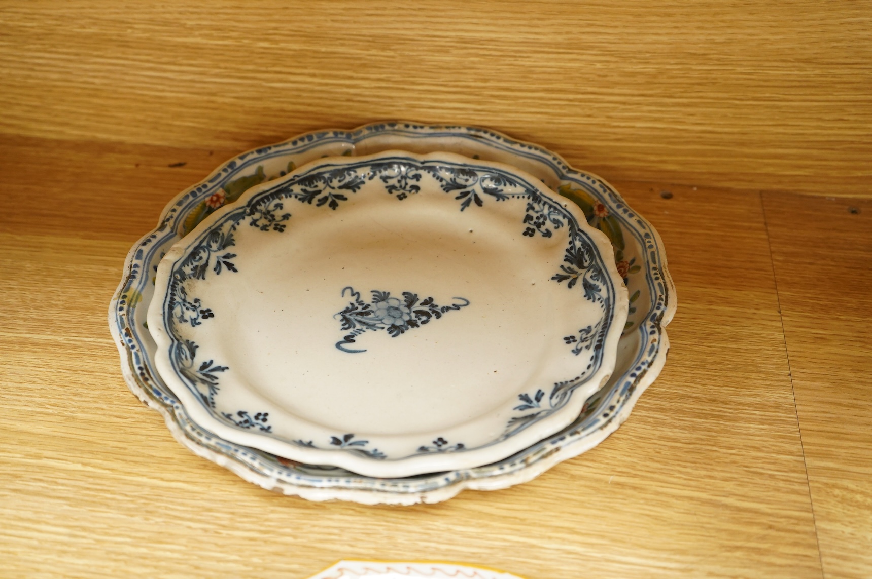 Lot 318 , An 18th century German faience dish and two 19th century French faience dishes/plates, largest 39cm
