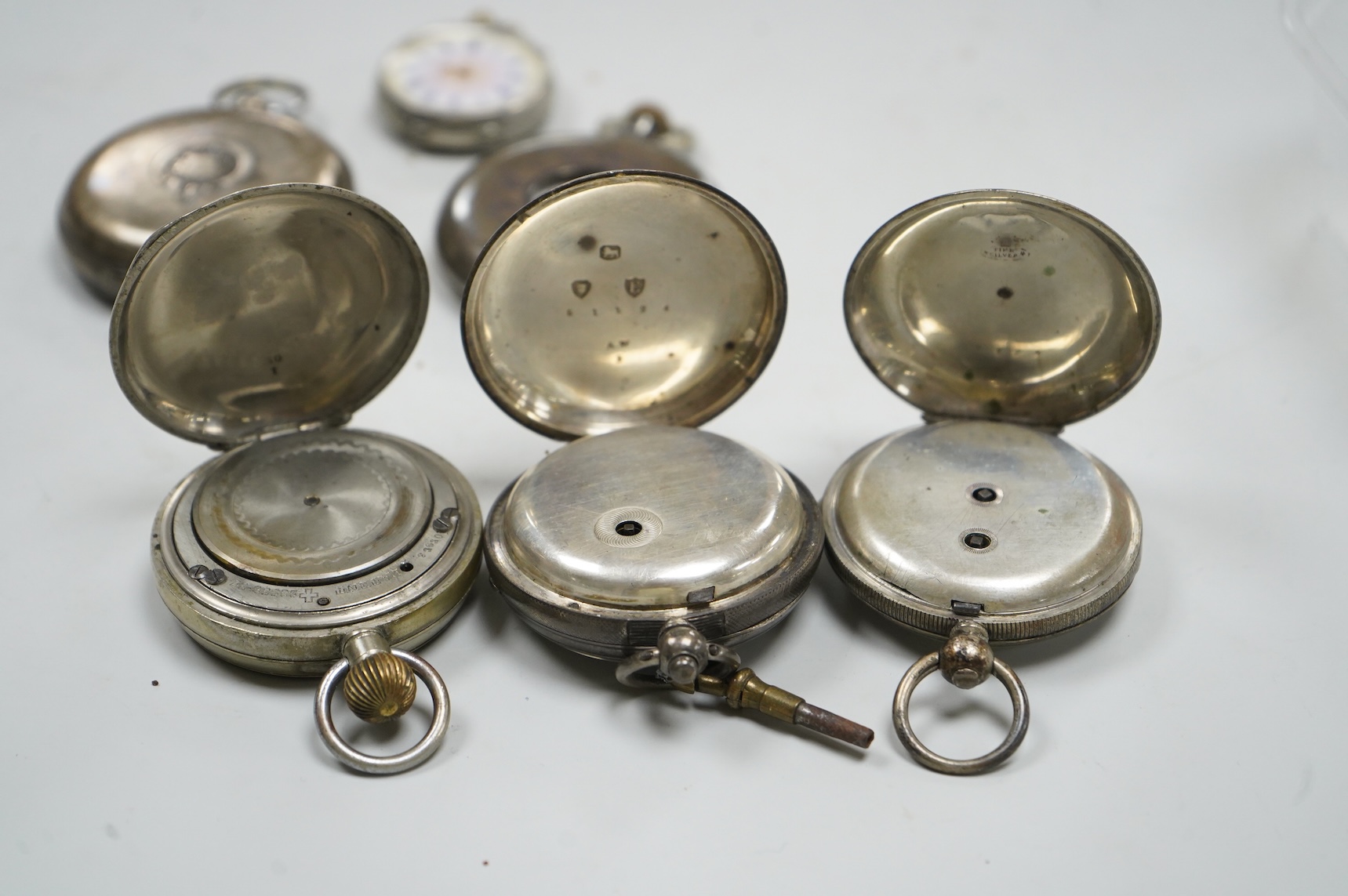 Two late Victorian silver open faced keywind pocket watches by L. Beha, Bridgend and Jenkins, Merthyr, together with a George V silver half hunter keyless pocket watch by Thos. Russell & Son, a lady's 935 fob watch and two base metal pocket watches.