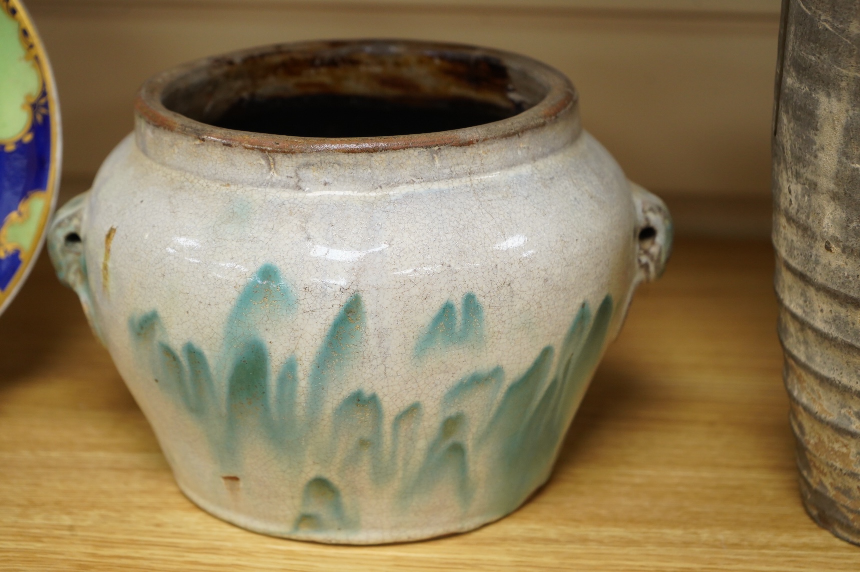 A Chinese Guandong kilns polychrome glazed jardiniere, 19th century, with lug handles, and two South East Asian pottery jars, possibly 16th-18th century tallest 31cm