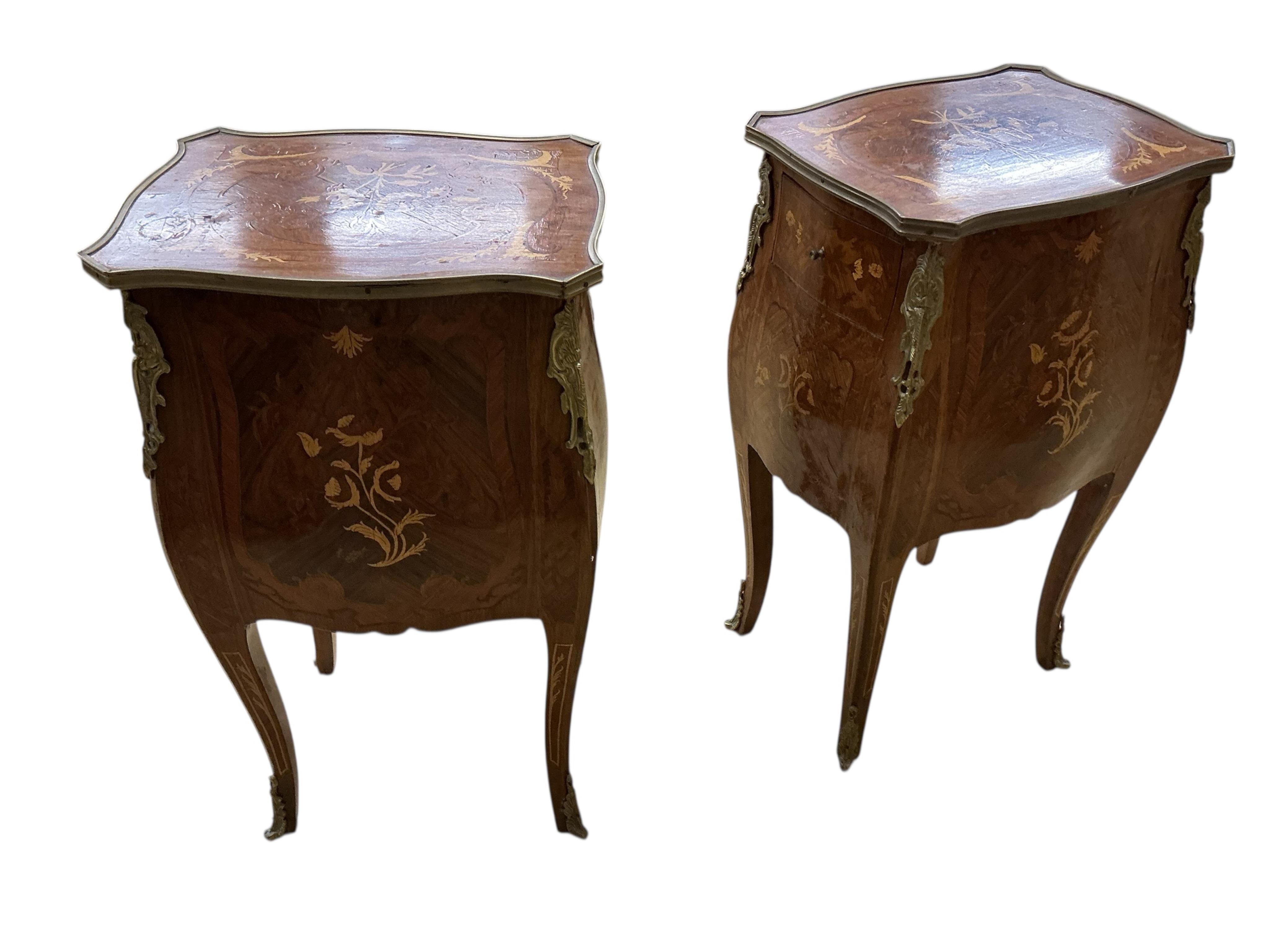 Lot 142 , A pair of Louis XVI style bombe bedside chests, width 43cm, depth 34cm, height 79cm