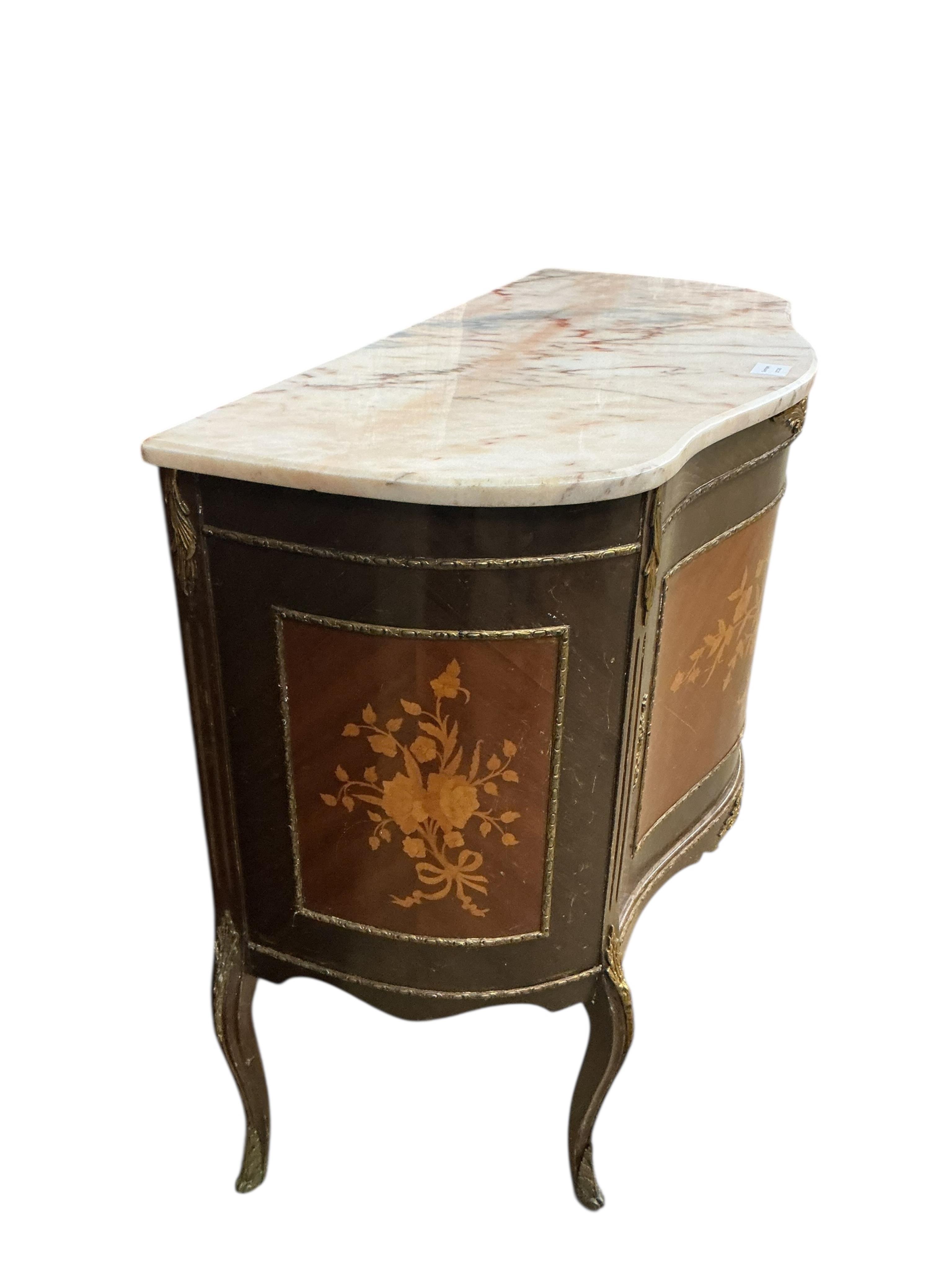 Lot 140 , A reproduction Louis XVI style serpentine marble top side cabinet, width 89cm, depth 43cm, height 83cm