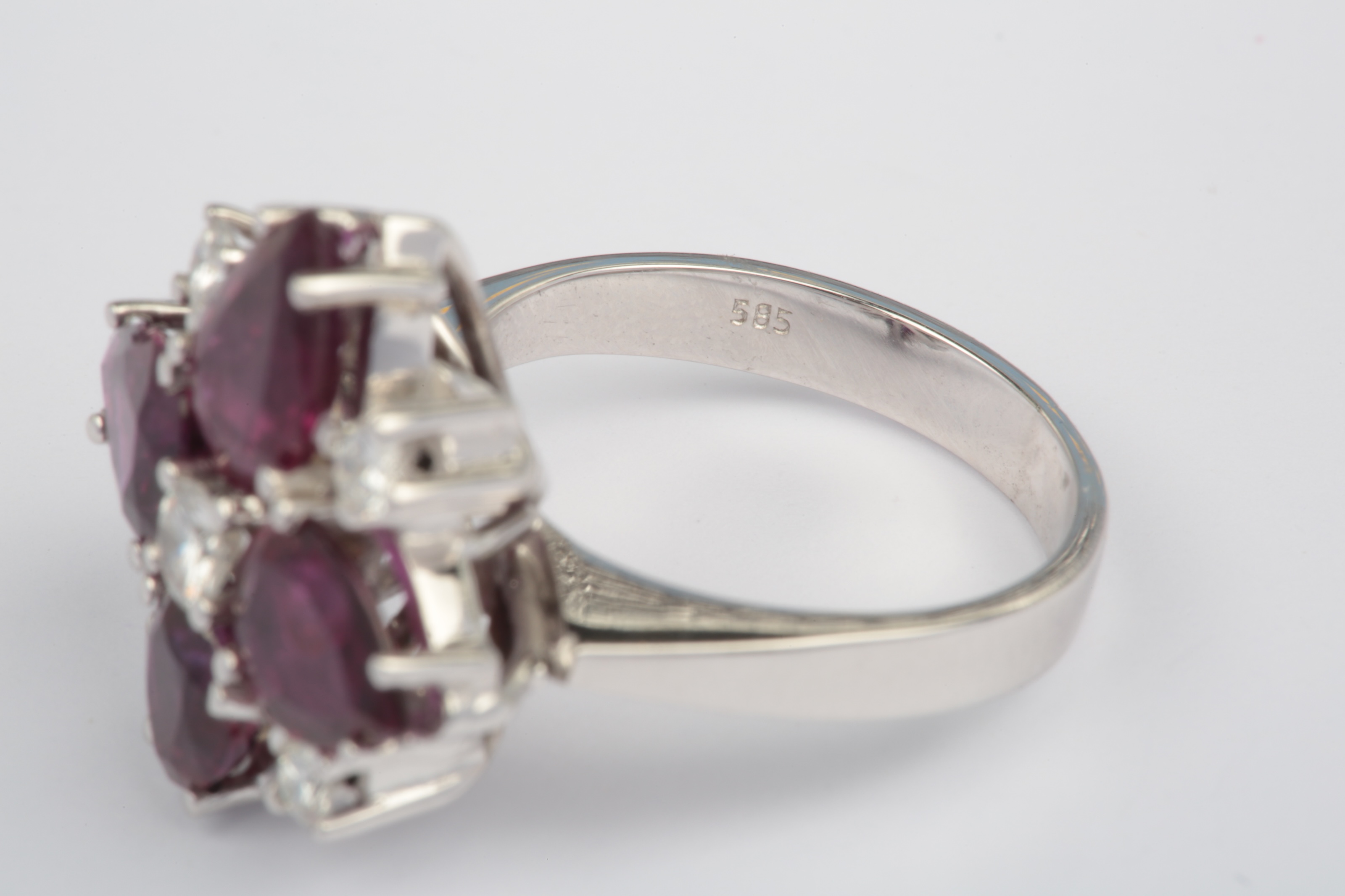 A ruby and diamond cluster ring, set with four pear-shaped rubies and five brilliant-cut diamonds in a quatrefoil arrangement, mounted in white gold, size J1/2, stamped 585, gross weight approximately 6 grams