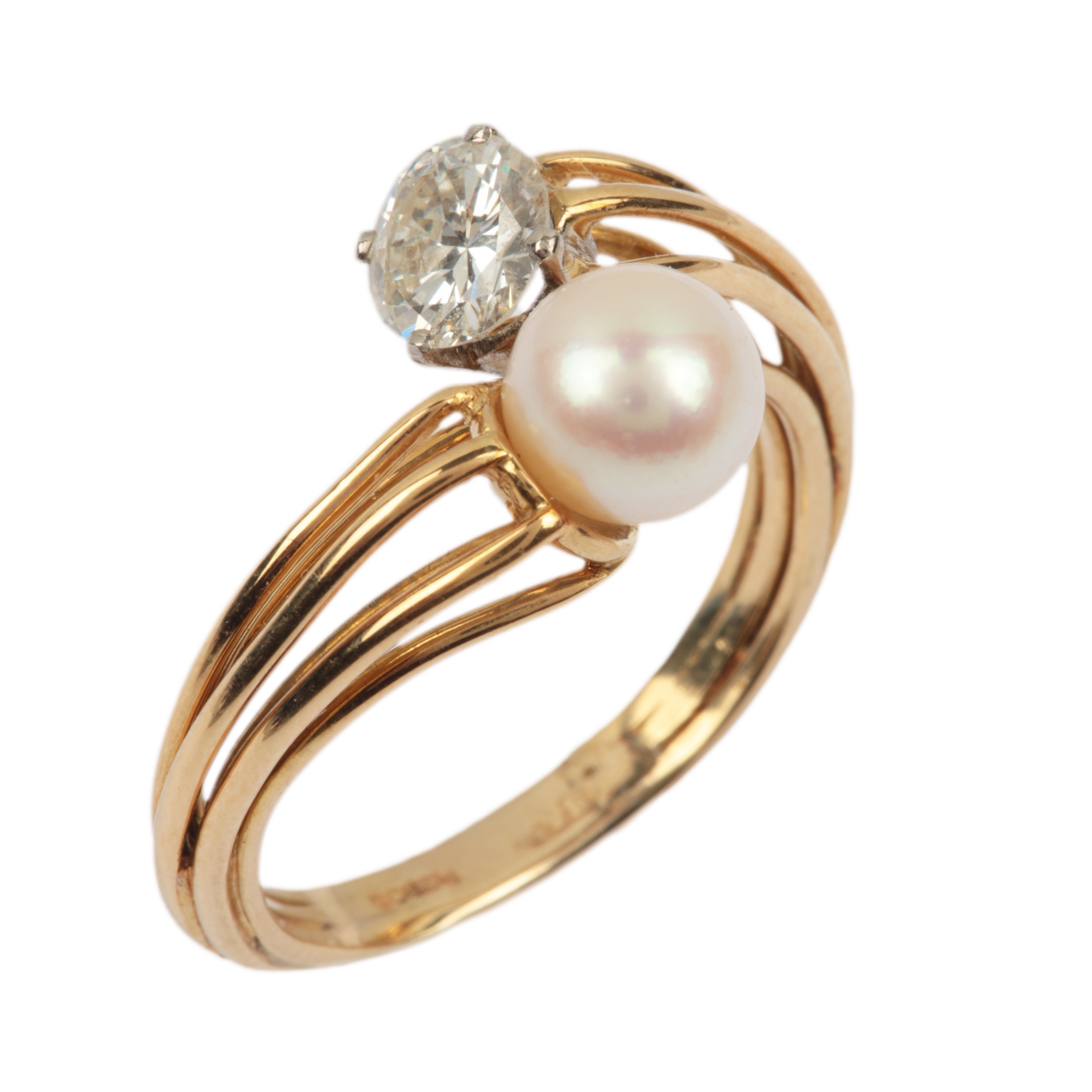 A cultured pearl and diamond 'toi et moi' ring, mid 20th century, of crossover design, set to one side with a cultured pearl, the other with a circular-cut diamond weighing 0.67 carats, the wirework band in 14ct gold, size O, later British hallmarks, gross weight 5 grams