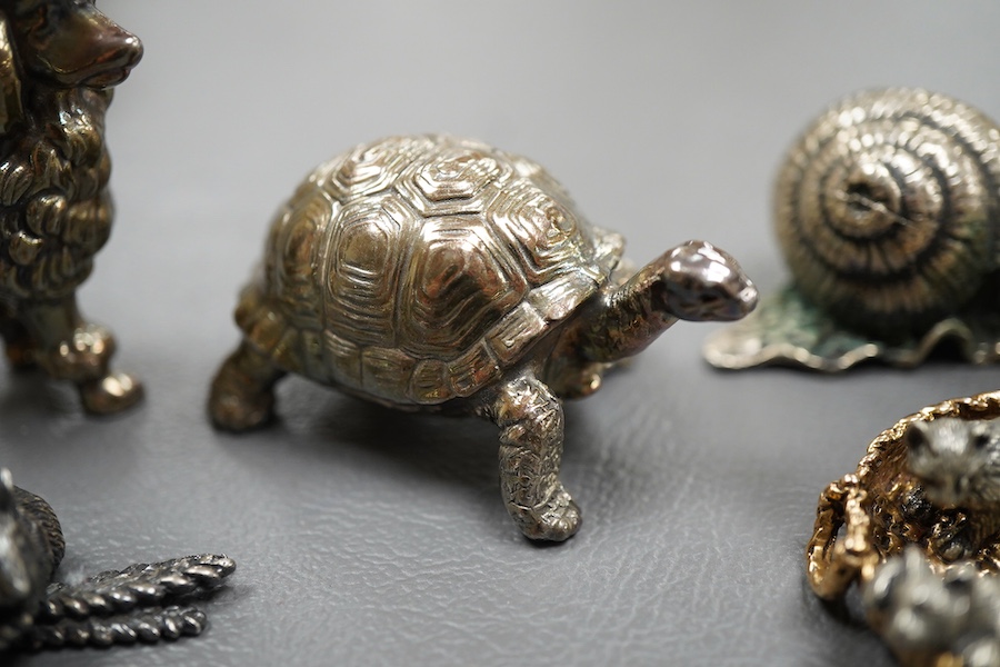An Italian gilt white metal group, depicting three kittens in a basket, (a.f.), diameter 33mm, an 800 standard white metal model of a snail, a silver model of a field mouse with sheaf, a 925 tortoise and a white metal poodle.