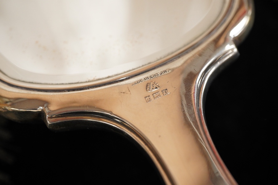 A cased six piece engine turned silver mounted dressing table mirror and brush set, by Adie Brothers, Birmingham, 1951, mirror 29cm.