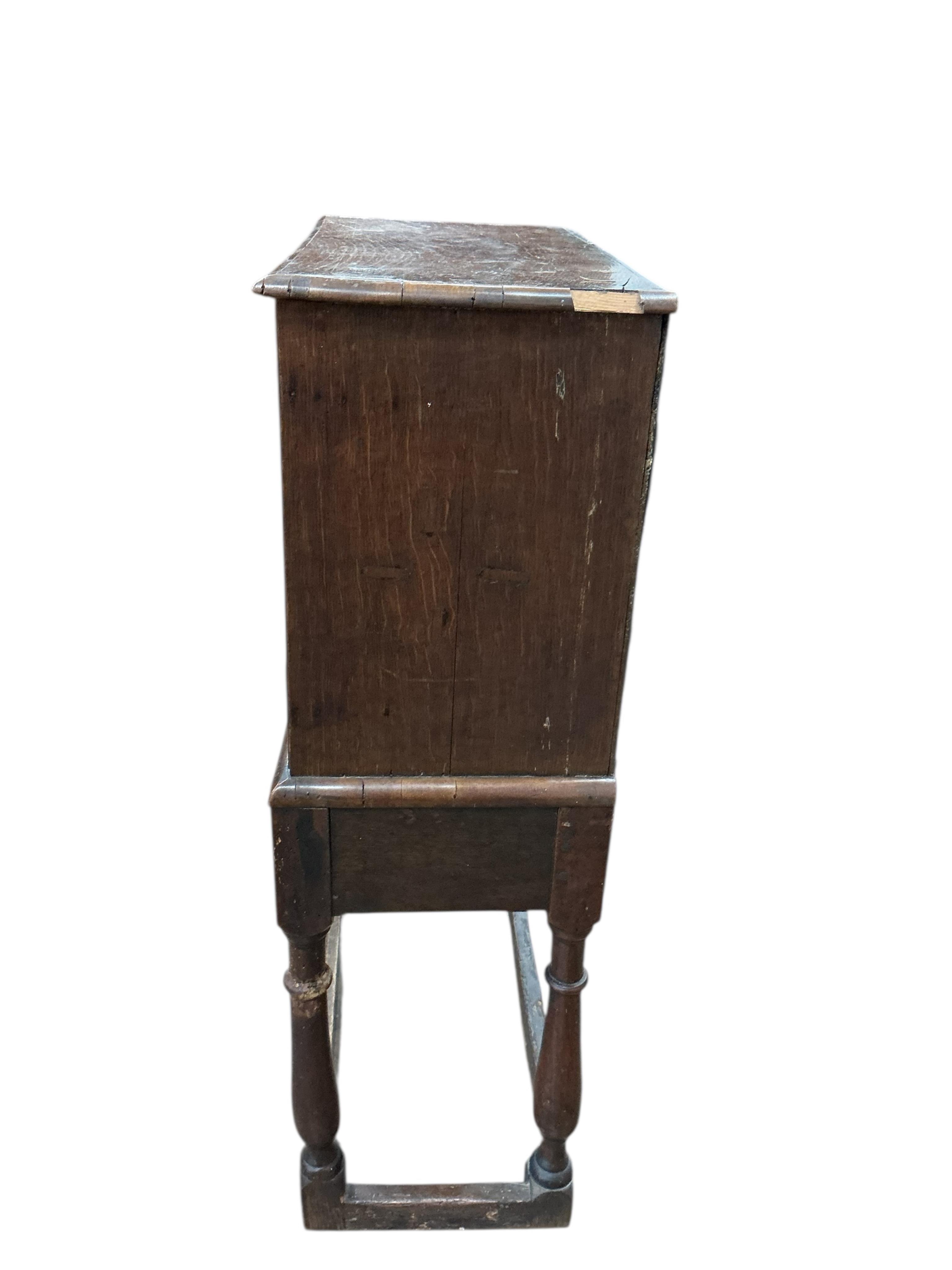 Lot 1479 , A small 18th century oak and walnut feather banded cabinet on stand, width 54cm, depth 28cm, height 90cm