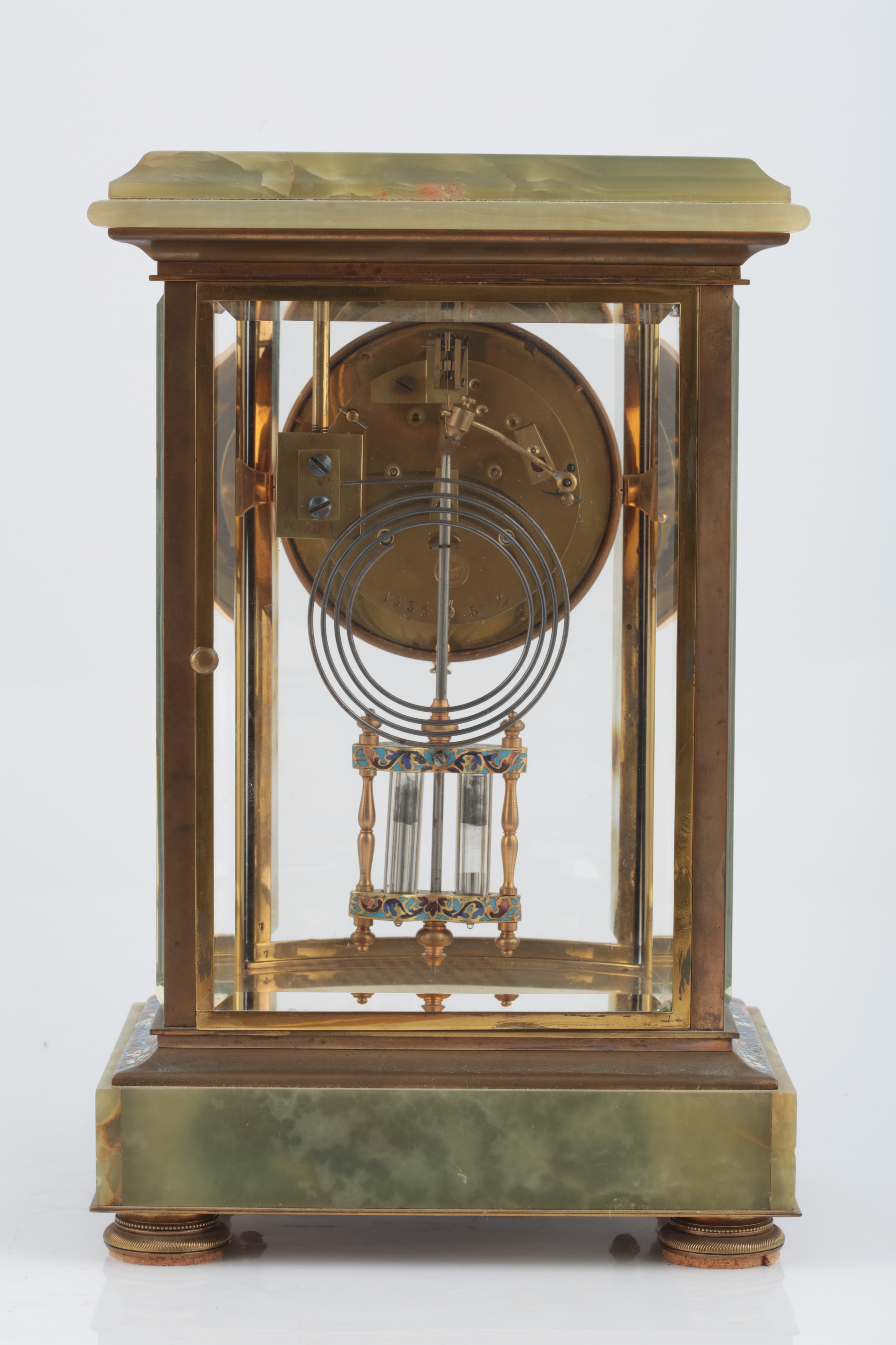 Lot 241 , A French onyx and champleve enamel four glass mantel clock