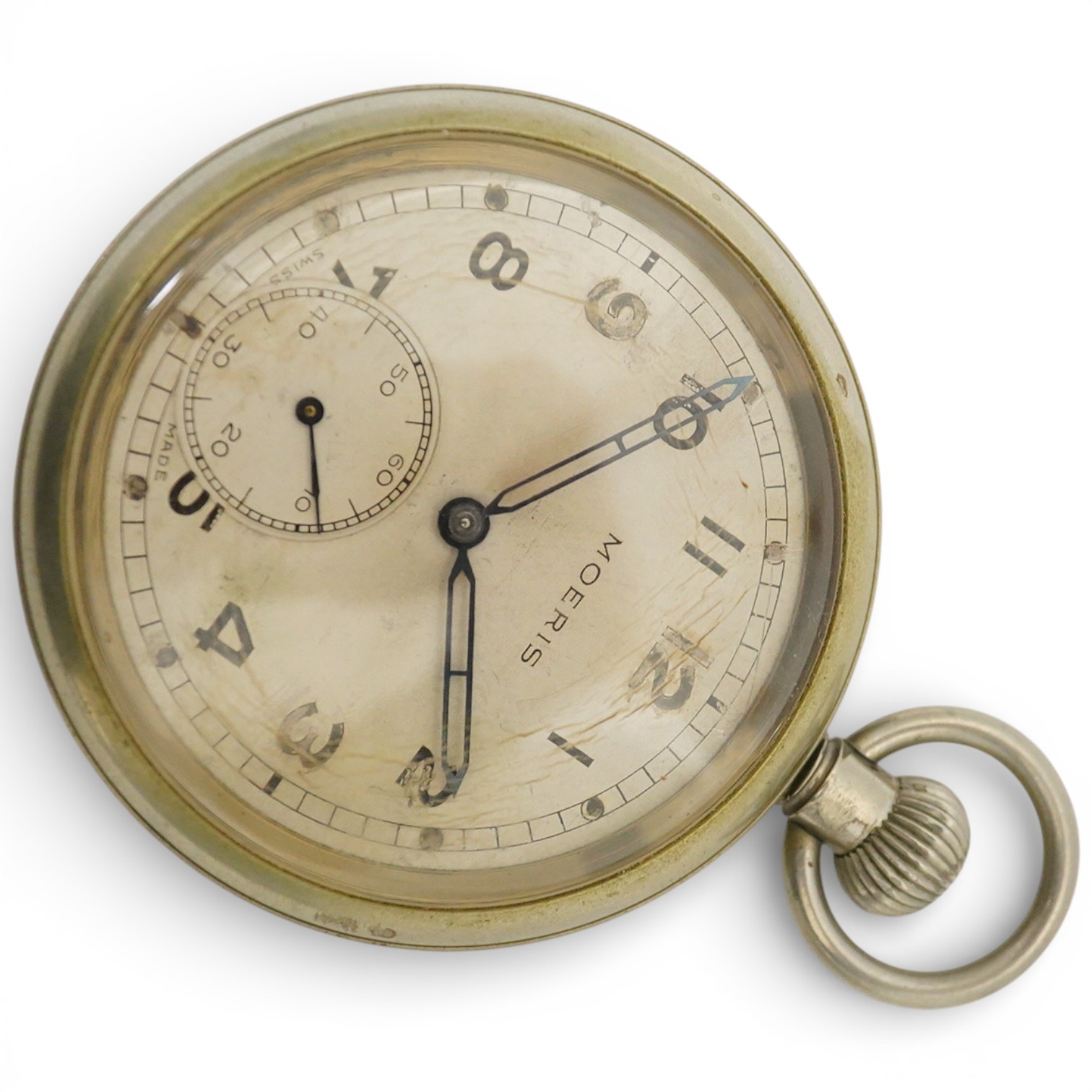 Lot 1086 , A nickel cased Moeris military G.S.T.P. (General Service Trade Pattern) open face pocket watch, with Arabic dial and subsidiary seconds, case diameter 50mm.
