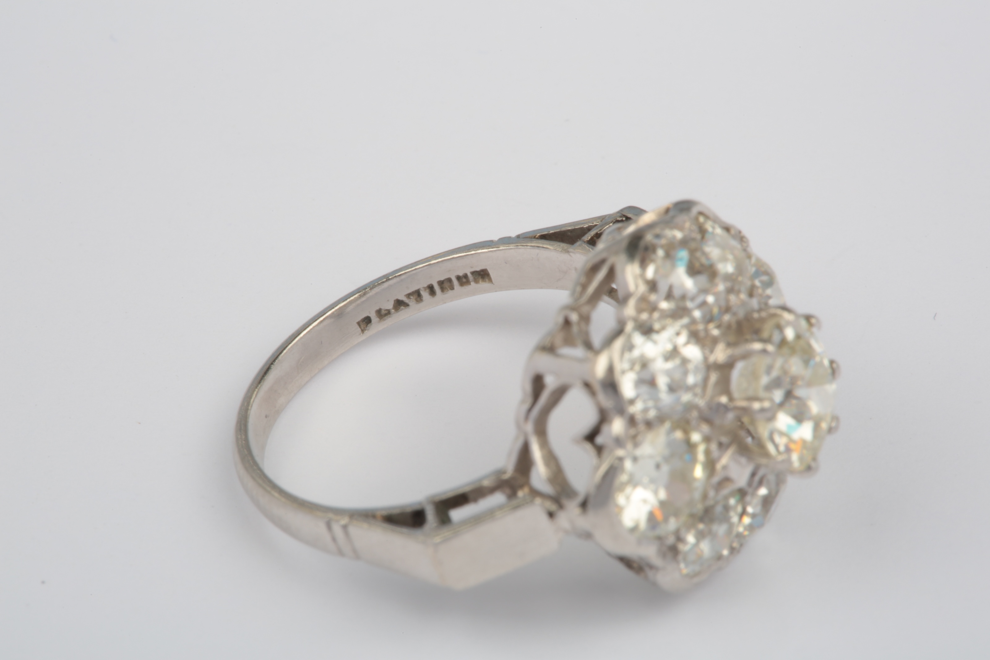 A diamond cluster ring, 1930s, set with circular-cut diamonds totalling approximately 3.50 carats, mounted in platinum, size M1/2, stamped PLATINUM, gross weight approximately 6.5 grams