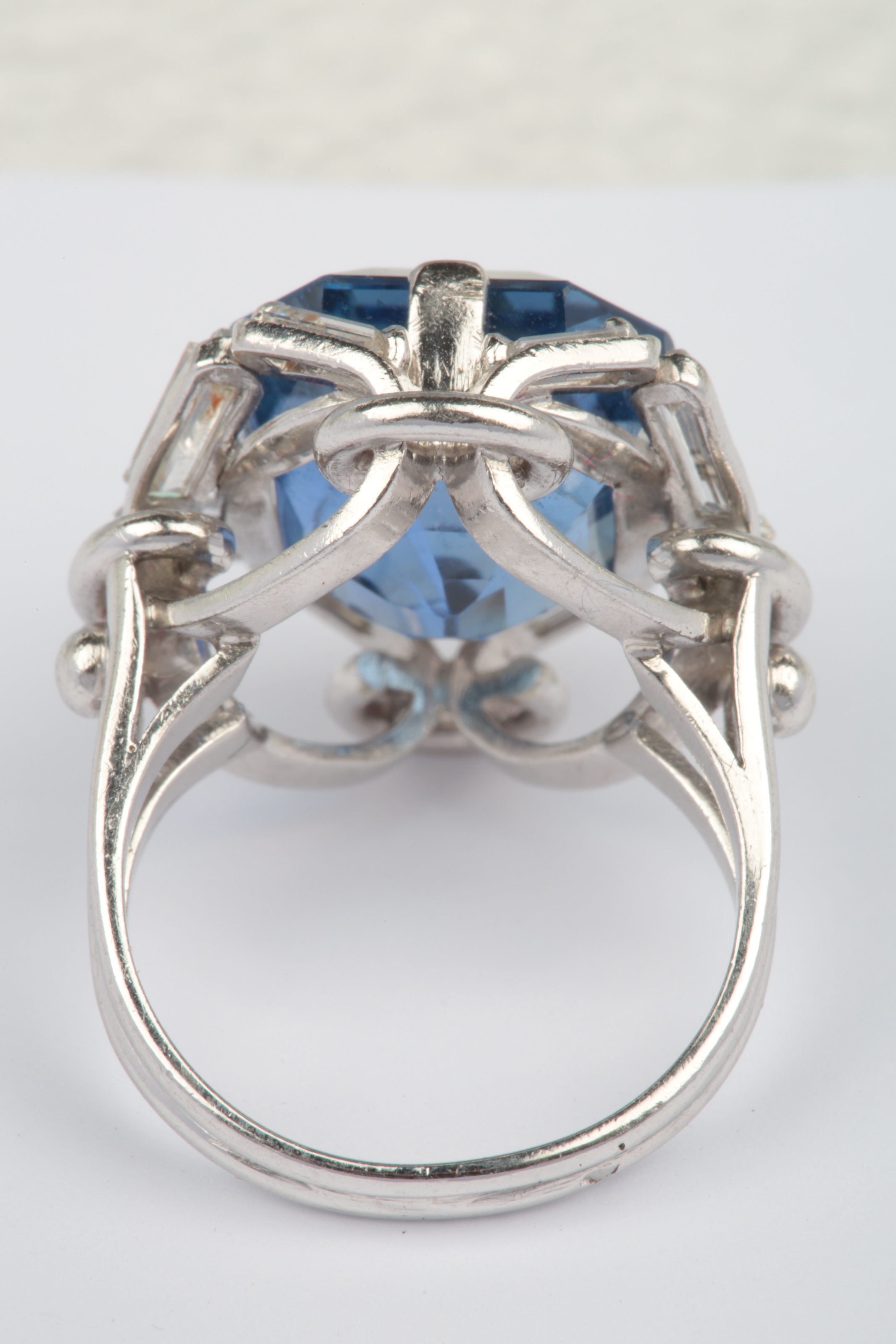 An impressive sapphire and diamond ring, France, claw-set with an octagonal step-cut sapphire weighing 16.57 carats, within a border of baguette diamonds totalling approximately 0.90 carats, mounted in platinum, gross weight approximately 13 grams