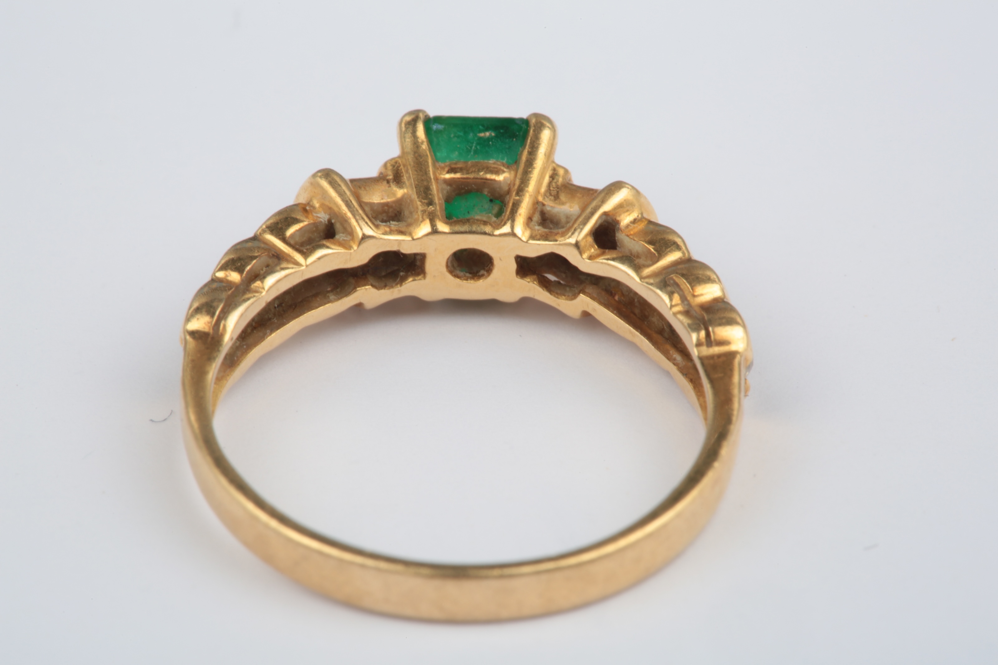 An emerald and diamond ring, claw-set with a step-cut emerald weighing approximately 0.50 carats, to shoulders set with tapered baguette and brilliant-cut diamonds totalling approximately 0.40 carats, mounted in 18ct gold, size M, British hallmarks for 18ct gold, 'British hallmarks, gross weight approximately 3.3 grams