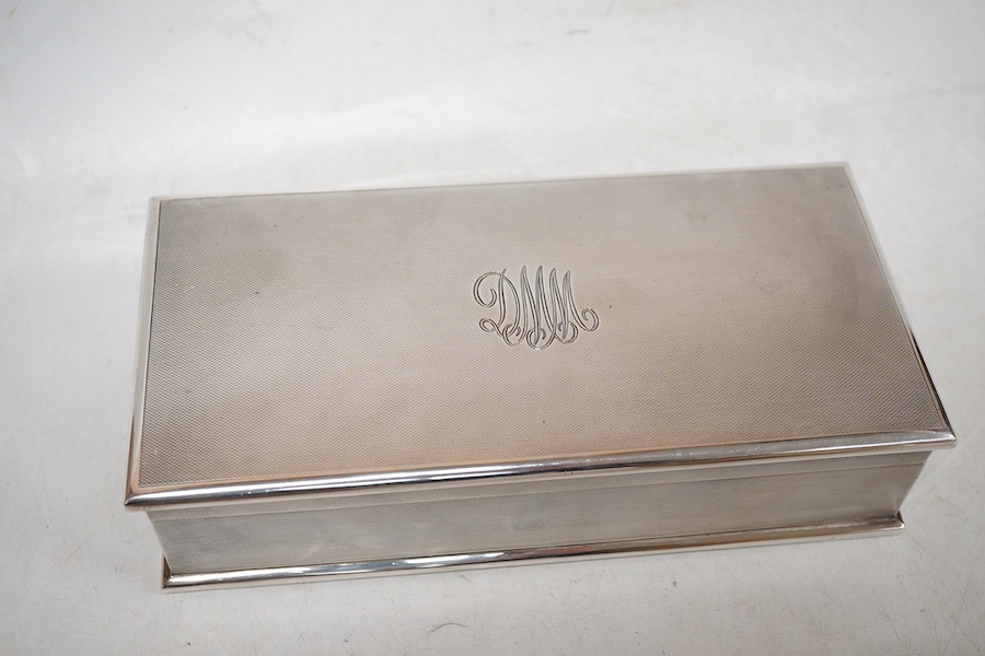 An Elizabeth II engine turned silver mounted rectangular cigarette box, by A. Wilcox, Birmingham, 1957, 19.4cm, together with a pair of modern silver mounted wine coasters.