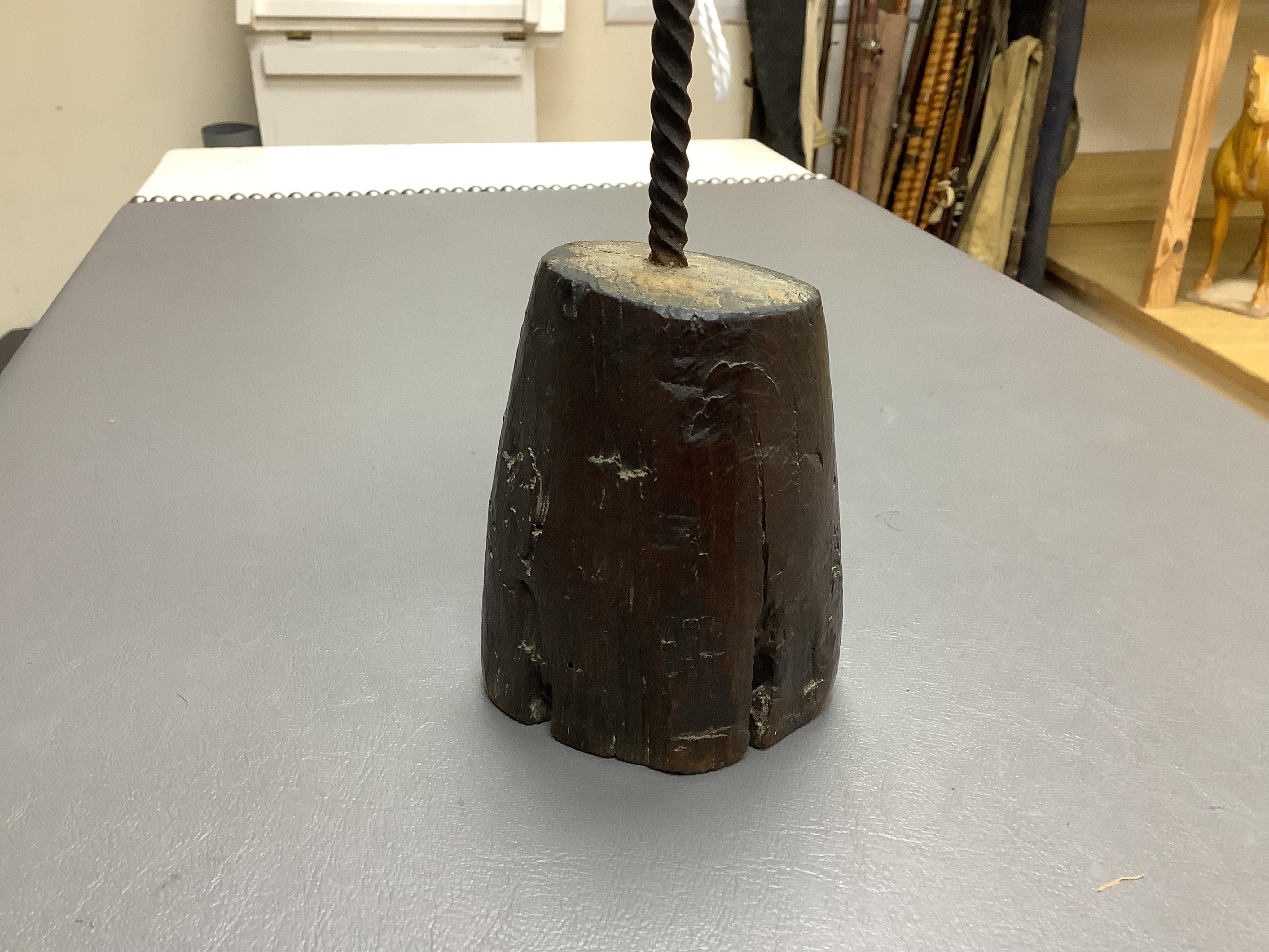 Lot 254 , A 17th/18th century iron rushlight nip, on oak mount, 25cm