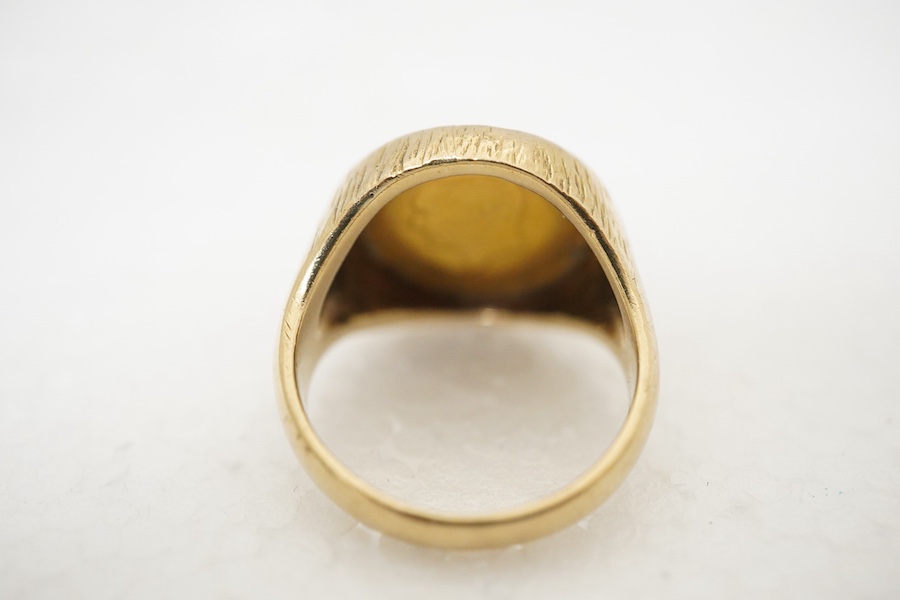 A 9ct gold ring, inset with a Turkish gold coin, size N, gross weight 8 grams.
