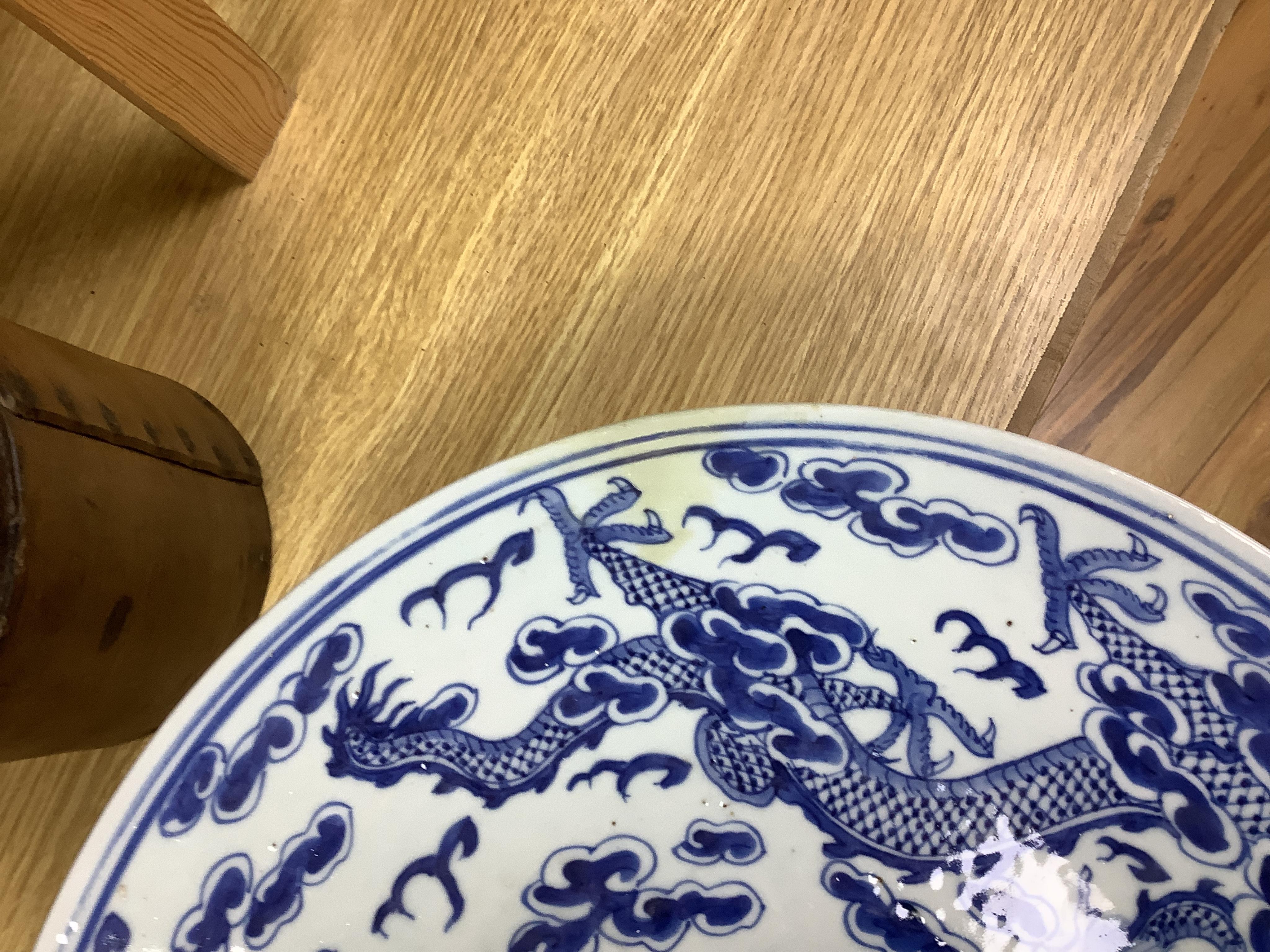 A Chinese blue and white charger decorated with dragons chasing the flaming pearl, 38cm in diameter