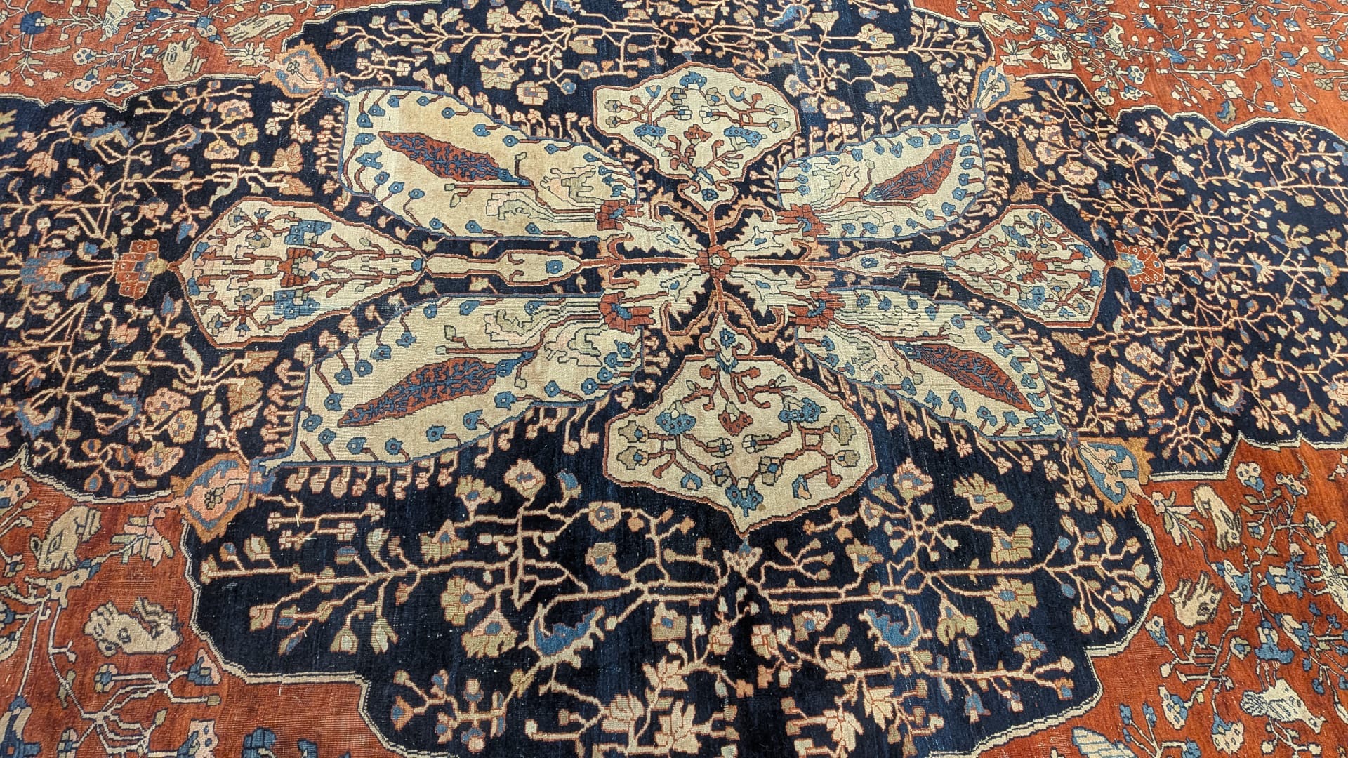 An antique Sarouk brick red ground carpet, with large central floral medallion within a conforming field and multi border, 663 x 415cm