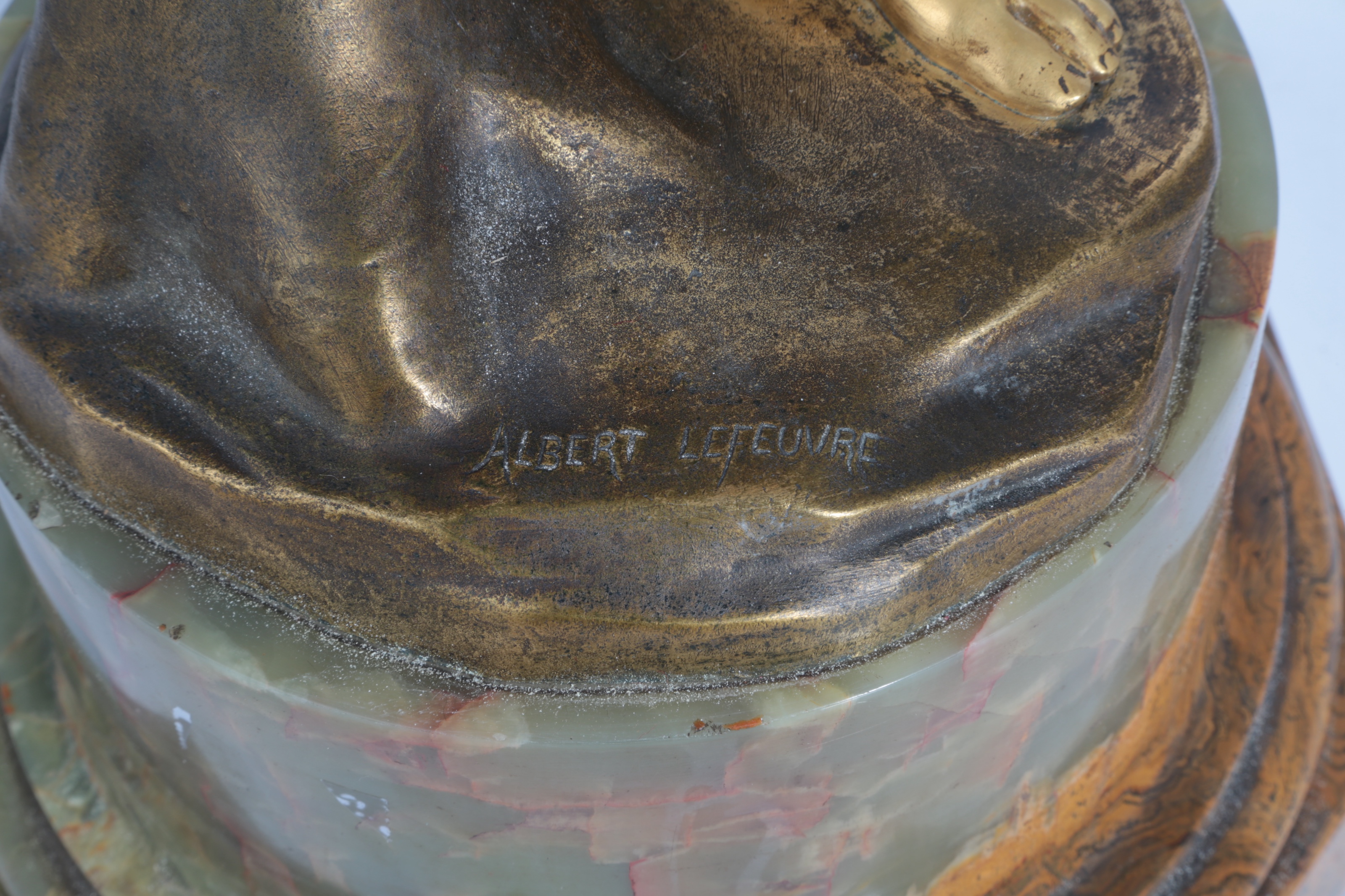 Louis-Albert Lefeuvre (French, 1845-1924) 'Muse des Bois', a classical nude maiden playing the pipes, modelled leaning against a tree stump, signed "ALBERT LEFEUVRE" and with foundry mark to the base, raised on a onyx socle, 67cm high overall