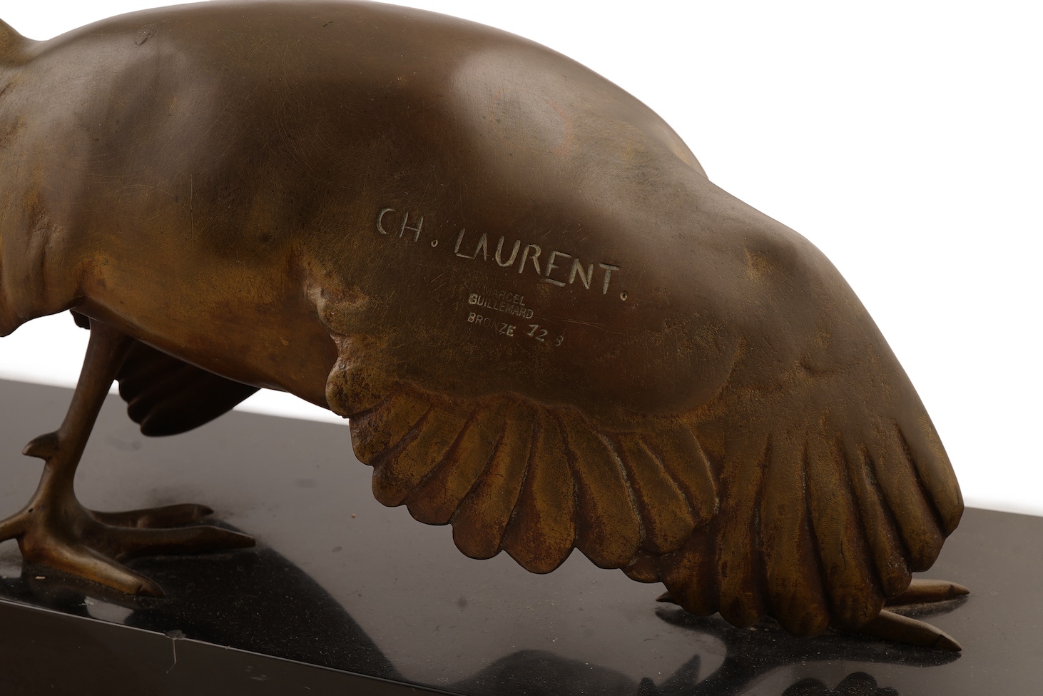 Georges Henri Laurent (French, 1880-1940) An Art Deco bronze group of two pheasants, signed and with Marcel Guillemard foundry mark, raised on a polished black slate pedestal, 110cm wide x 32cm high x 20cm deep overall