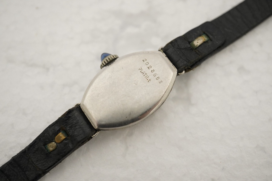 A lady's 1930's/1940's platine and diamond set manual wind cocktail watch, with tonneau shaped Arabic dial, case diameter 14mm,with cabochon set winding crown, on a leather strap.