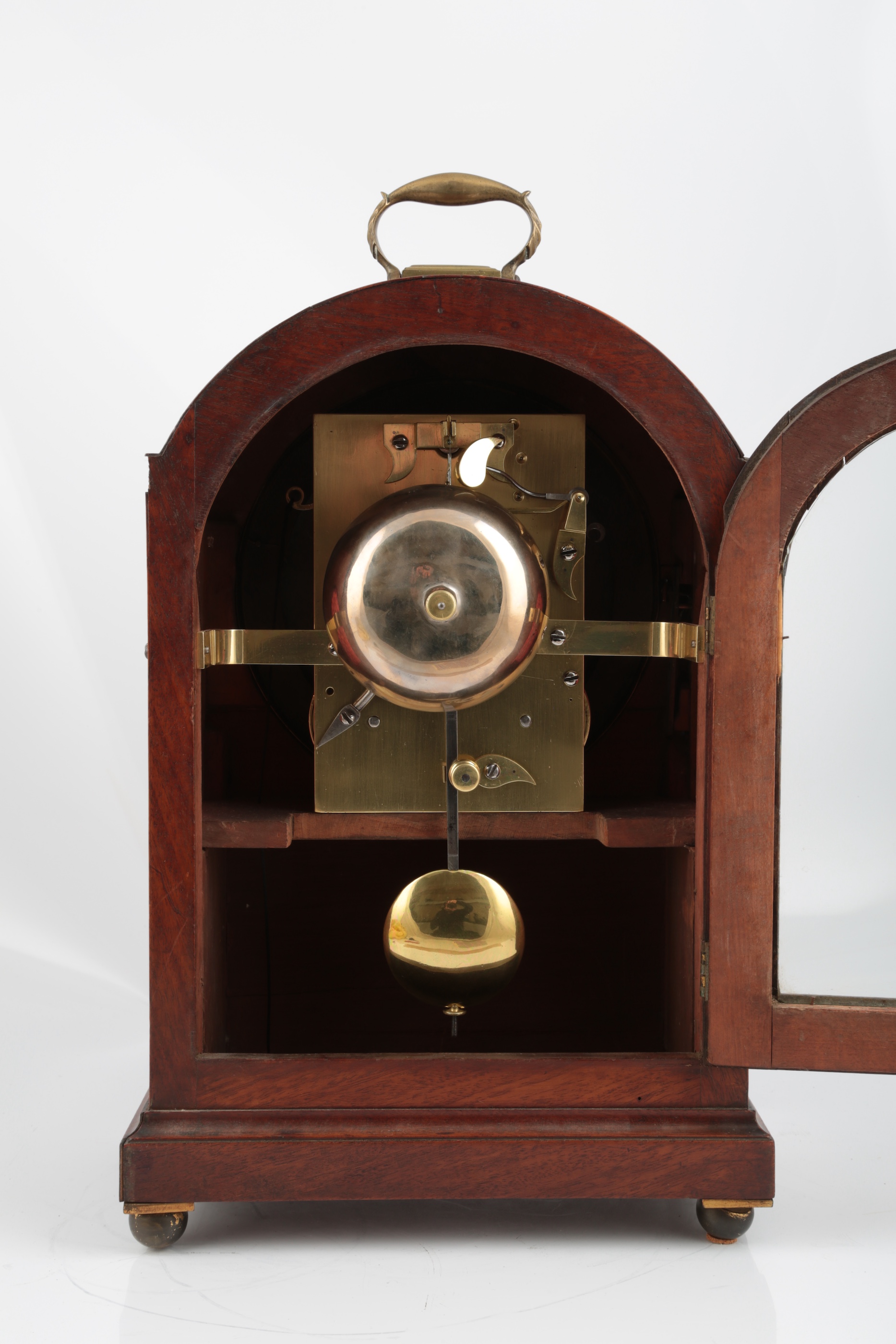 A Regency mahogany double fusee bracket clock, convex painted dial with Roman numerals and convex glass door with brass bezel, curved top with brass carrying handle, brass fretwork sides, glazed rear door with case key and brass ball feet, eight day movement with repeating mechanism and brass pendulum bob, striking on a bell, 39cm high not including the handle