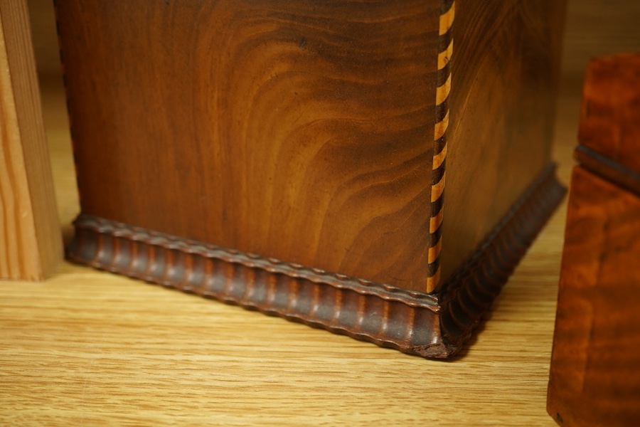 Lot 415 , A 19th century Danish mahogany and marquetry tea caddy, dated 1870, with bone handle together with a burr walnut box, no key, largest 27cm wide