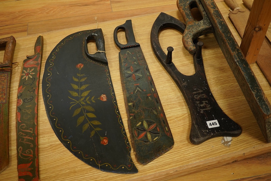 Lot 445 , Sixteen Danish decoratively chip carved and painted washing bats, mangle boards, 18th/19th century, one carved and dated 1785- 63cm long.