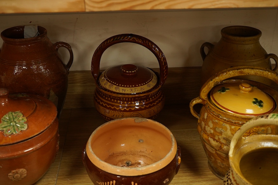 A collection of sixteen 19th century and later Danish and Swedish kitchen pots, possibly “Lindkvist Kvidinge” mostly coloured slip decorated earthenware handled pots, tallest 29cm