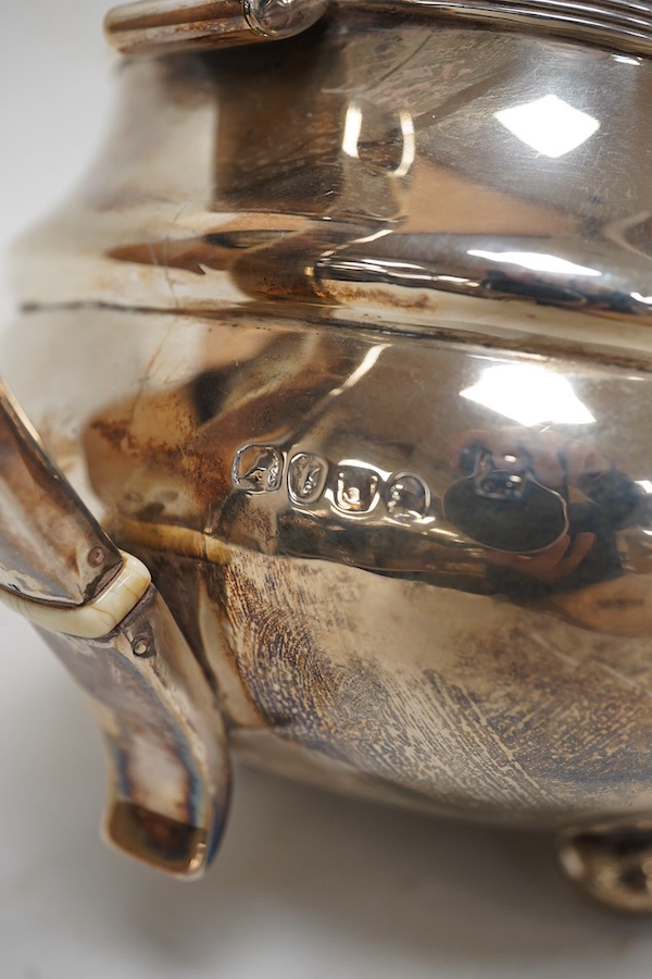 Lot 1036 , A George IV silver teapot by Thomas & George Hayter, of oval form, with reeded borders, on four bun feet, London, 1820, gross weight 18.2oz. CITES Submission reference, 4V1Y51SS