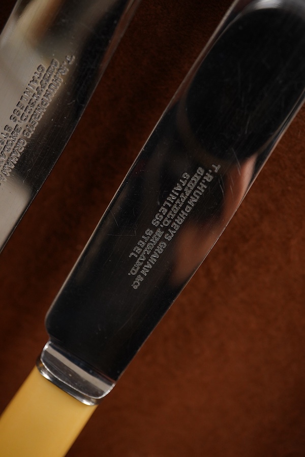 A vintage oak cased silver plated canteen of cutlery, the knives with ivorine handles