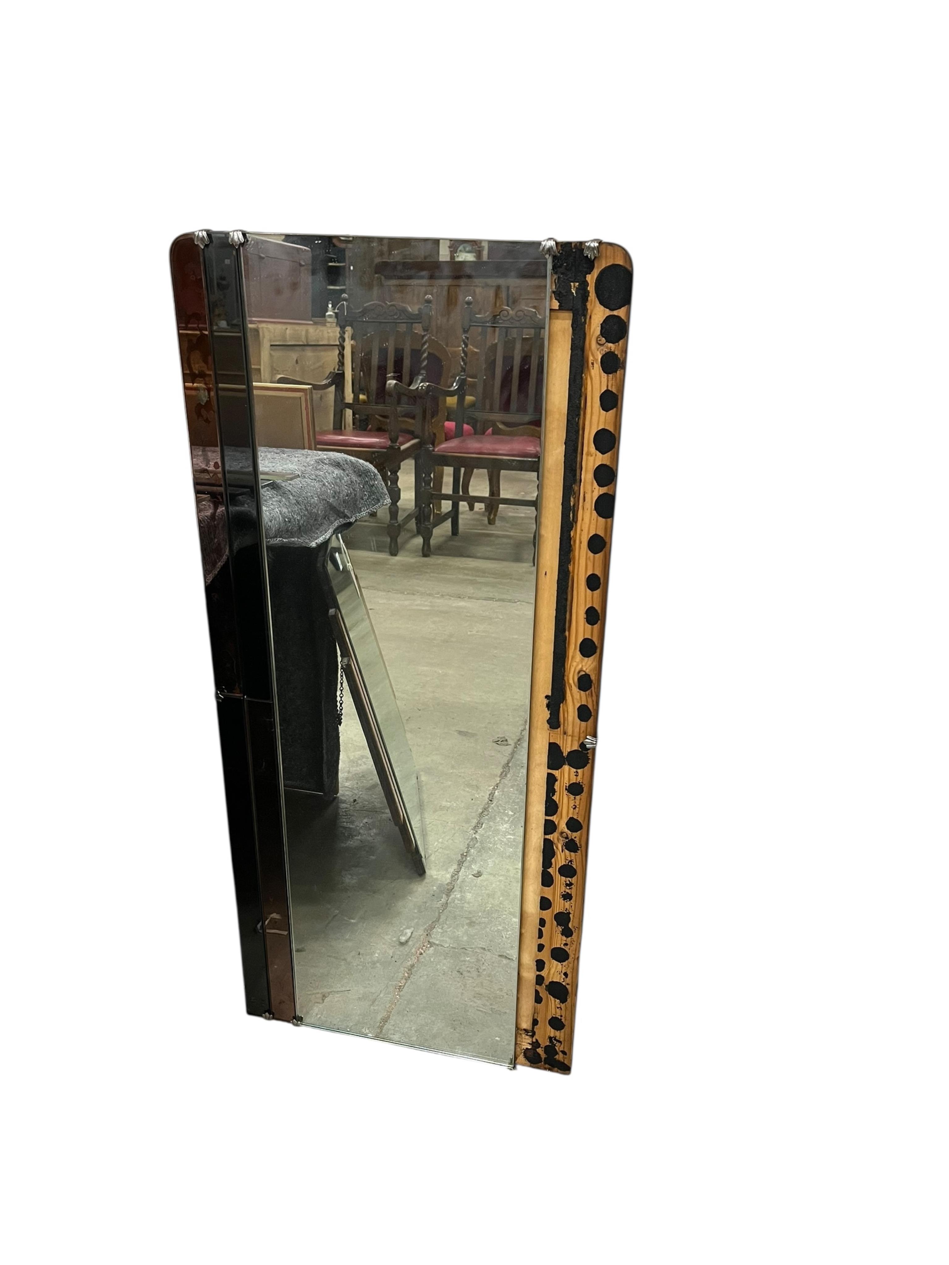 Two peach glass Art Deco mirrors, larger width 47cm, height 104cm, width 61cm, height 61cm