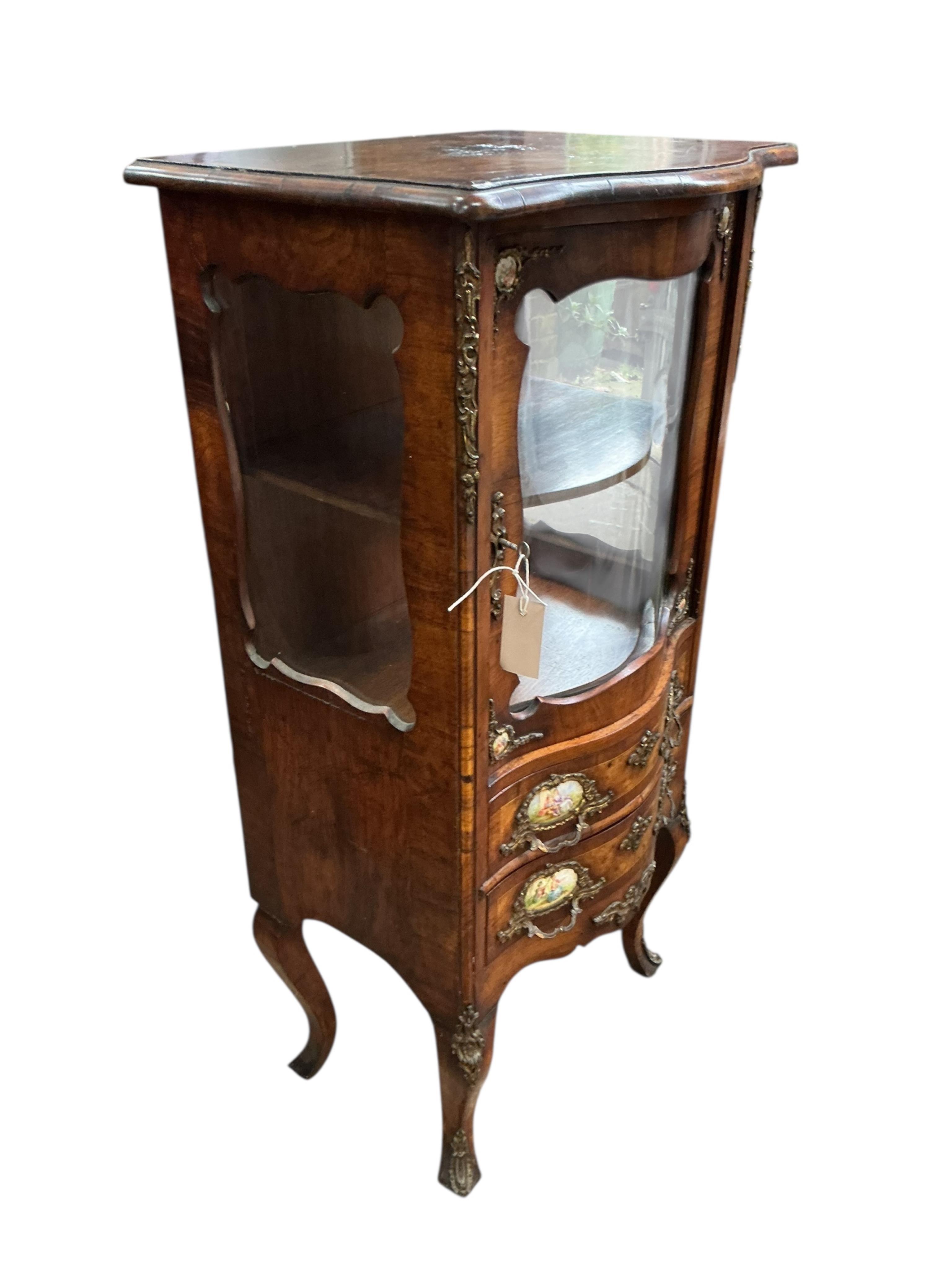 A Louis XV style walnut and porcelain mounted vitrine cabinet, width 50cm, depth 40cm, height 104cm together with a Louis XVI style kingwood, ormolu and Sevres style porcelain mounted tripod table, width 62cm, depth 46cm, height 59cm