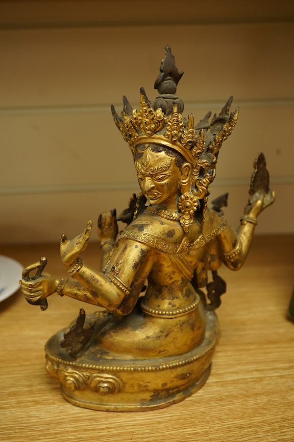 A Tibetan style gilt bronze seated figure of a multi headed Avalokiteshvara, 24cm high