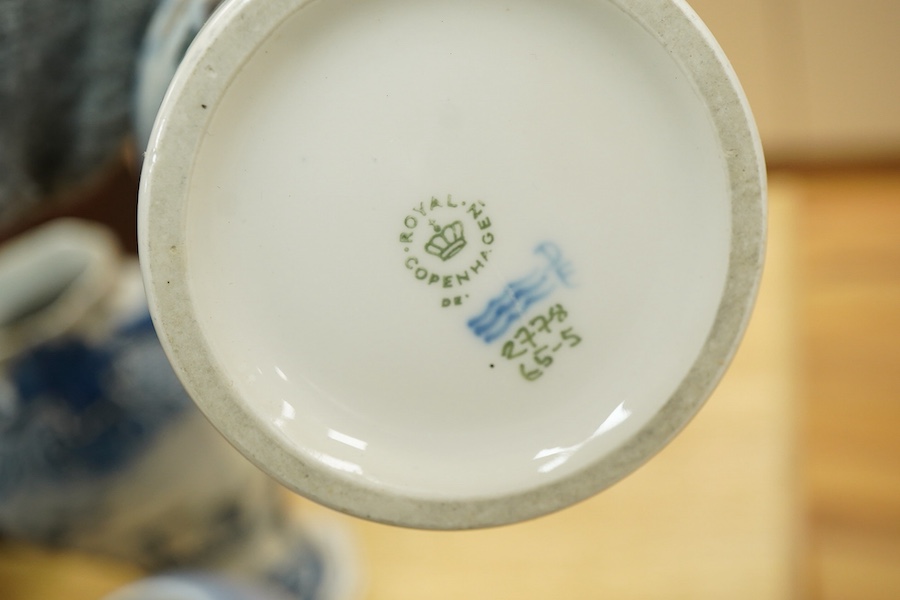 An 18th century Delft blue and white vase together with two Royal Copenhagen floral vases, largest 24cm high
