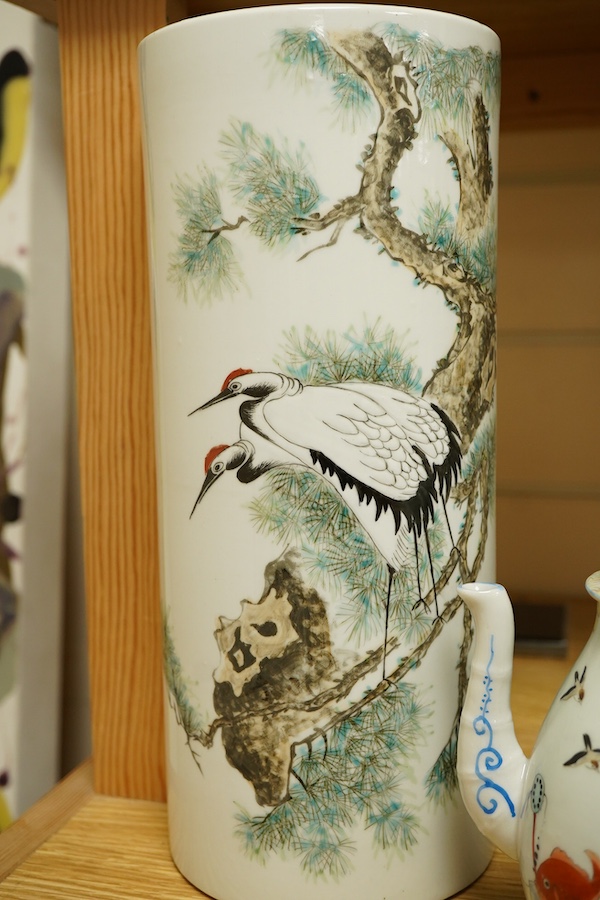 Lot 461 , A collection of Chines and Japanese ceramics, a Satsuma figural covered incense burner - 19cm high, a collection of Kutani and a pair of tall Chinese sleeve vases, depicting cranes in trees (11).