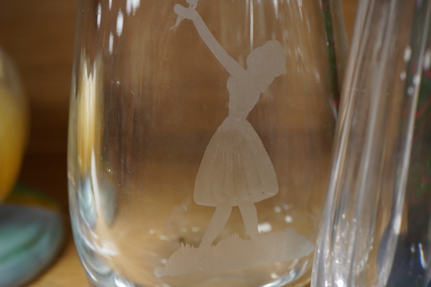 Lot 3148 , A mid 20th century Orrefors figural engraved decanter and stopper, height 25cm, two similar vases and a later green blue and red glass vase, (4).