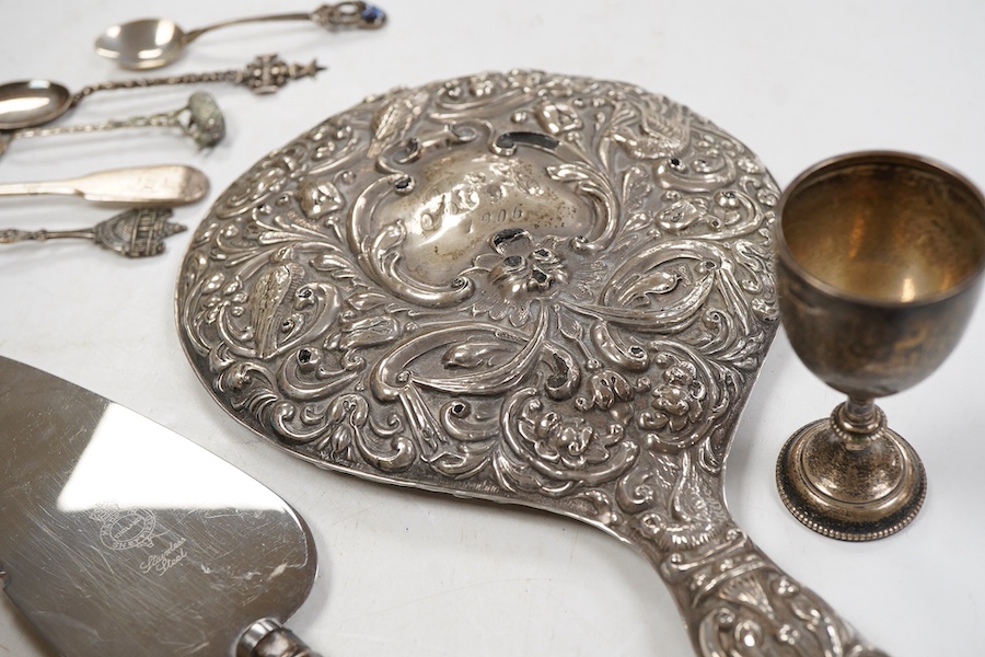 An Edwardian repousse silver mounted hand mirror, a silver mounted hair brush, small silver cup and sundry small flatware.