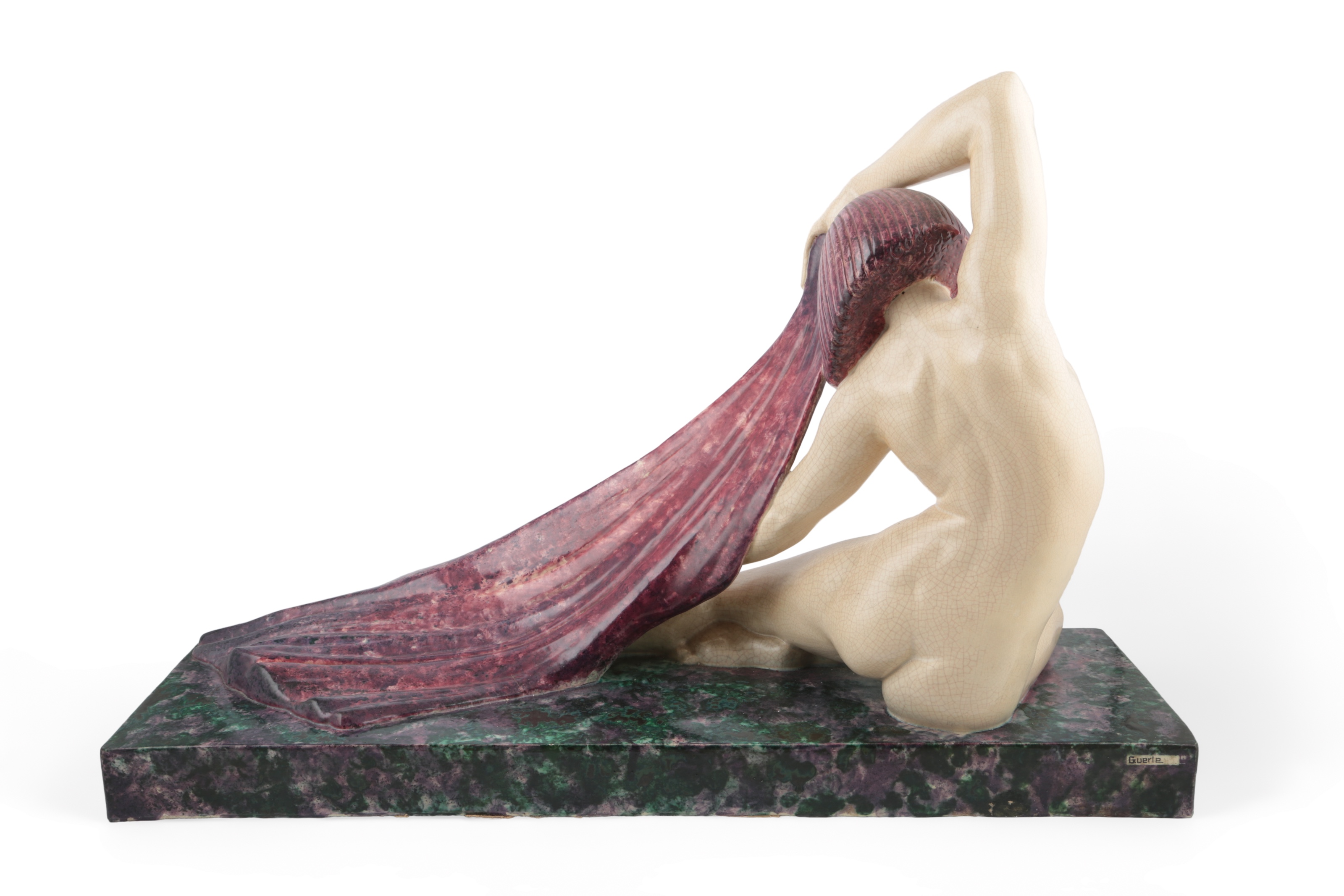 Marcel André Bouraine (French, 1886-1948) 'Guerle' a large Art Deco ceramic sculpture modelled as a nude female with long flowing scarf,