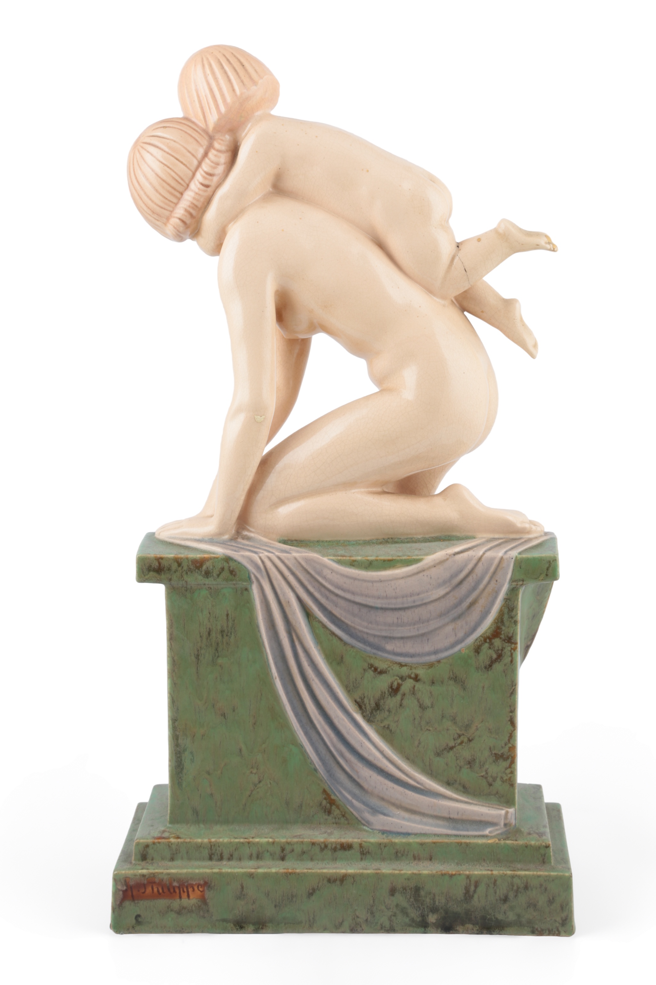 Abel Rene Philippe (French, 1898-1978) 'Mother and Child' an Art Deco style glazed pottery of a mother and daughter, the child modelled on her mother's back, the mother knelt on a swagged pedestal, signed verso, 55cm high x 29cm wide x 12cm deep