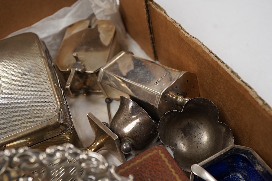 A late George VI silver three piece condiment set and two matching spoons, by Walker & Hall, Sheffield,1949/50, together with a pair of repousse silver bonbon dishes, three other silver condiments, a silver mounted cigarette box and a cased silver spoon & pusher.