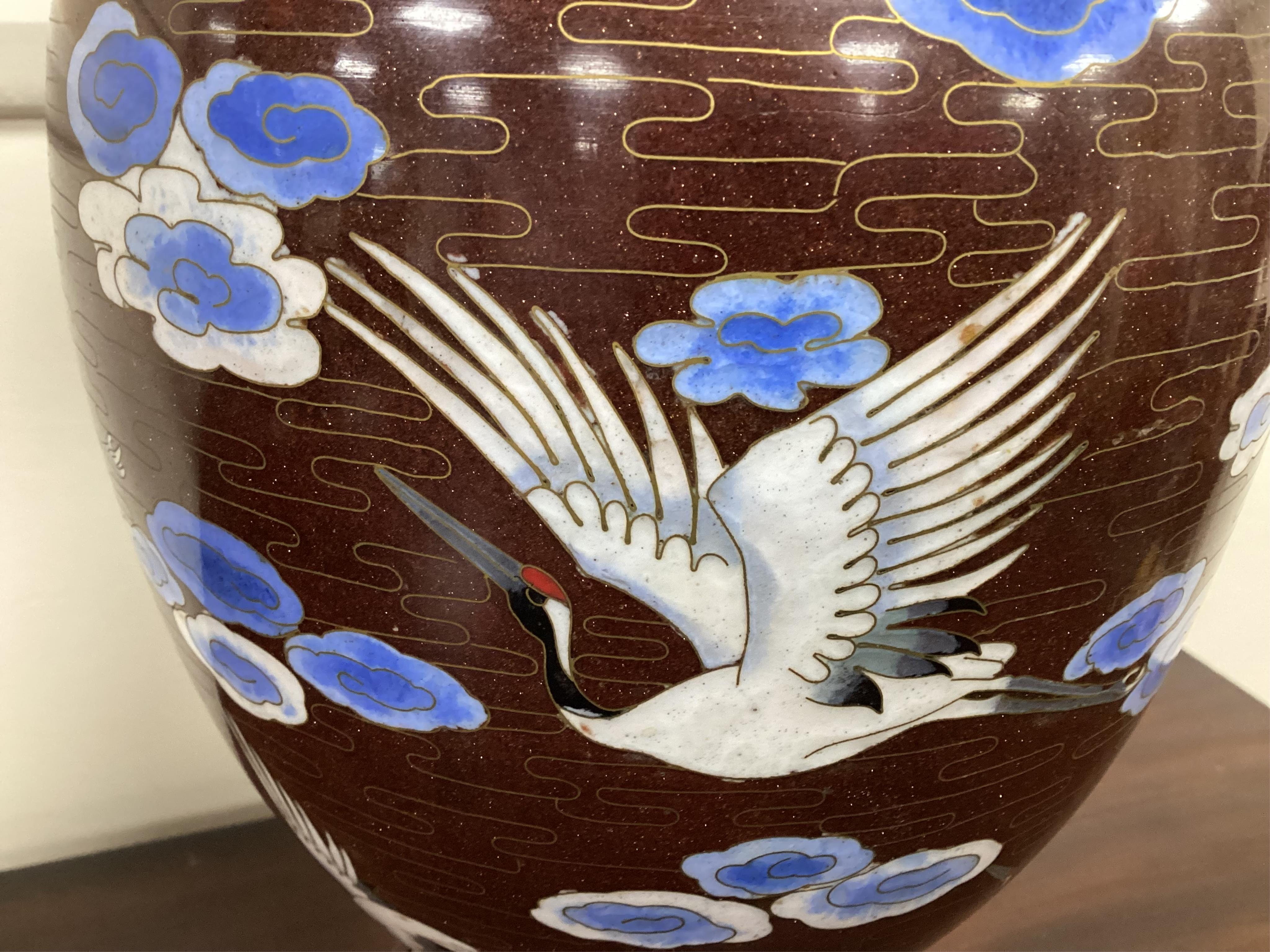 Lot 405 , A pair of Chinese cloisonne enamel crane vases on stands - 43cm high