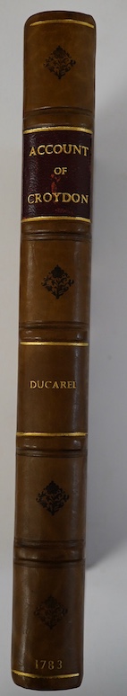 ° Ducarel, Andrew Coltee - Some Account of the Town, Church and Archiepiscopal Palace of Croydon ... (Bibliotheca Topograhica Britannica, no.XII). 8 plates (1 folded) and a plan; bound with - Bibliotheca Topograhica Britannica, no.XLVI (part 1 relates to Croydon). 3 plates and a folded map (of Surrey); newly rebound gilt and blind ruled half calf and marbled boards, blind decorated panelled spine with maroon label, 4to. printed by and for J. Nichols, 1783-87. *serving as the standard (and scarce) antiquarian history of the town