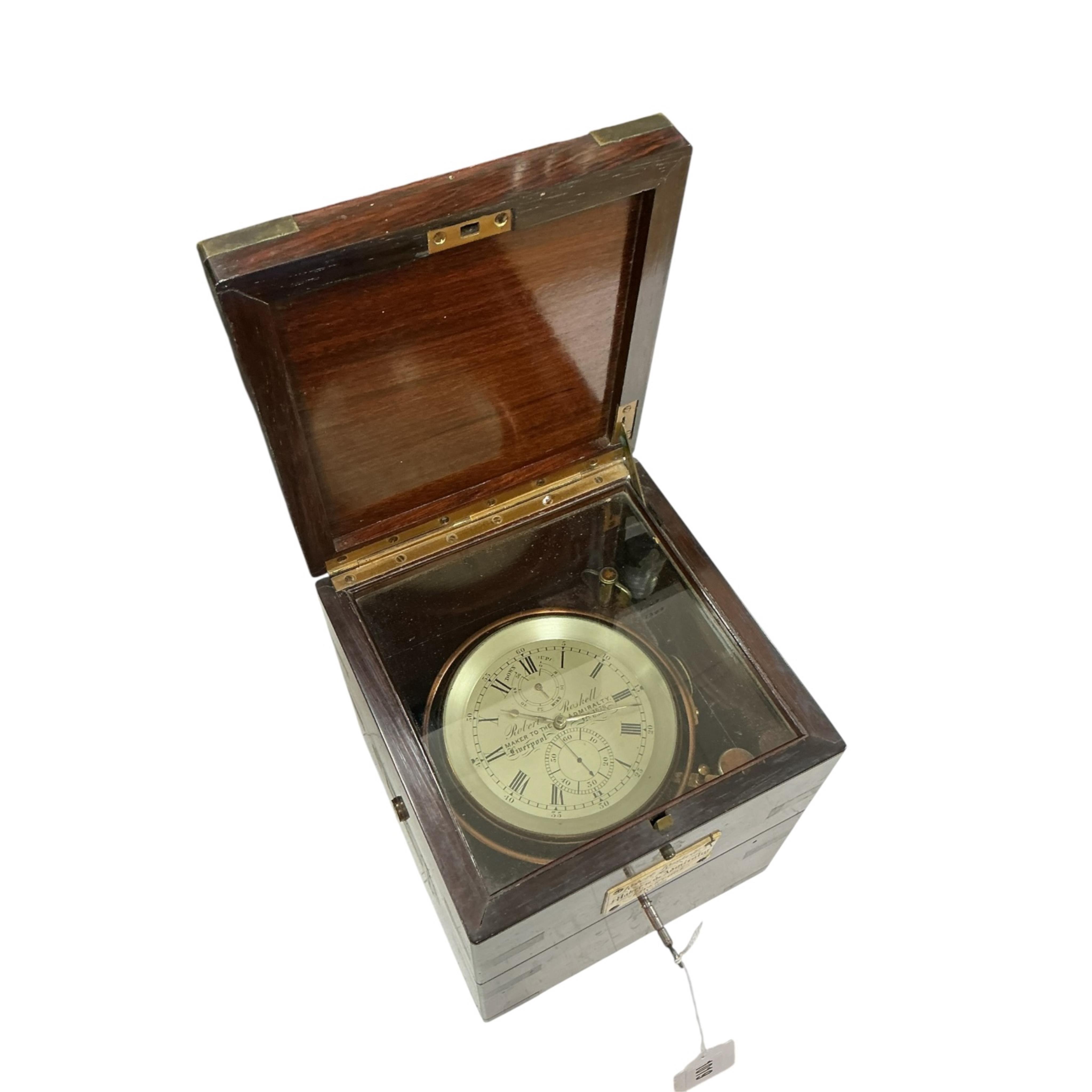Lot 1019 , A mahogany cased marine chronometer by Robert Roskell, Liverpool, No. 1676, 63305, four inch silvered dial with separate seconds dial, signed to the dial and also with applied ivory plaque to the case reading Robert Rosk
