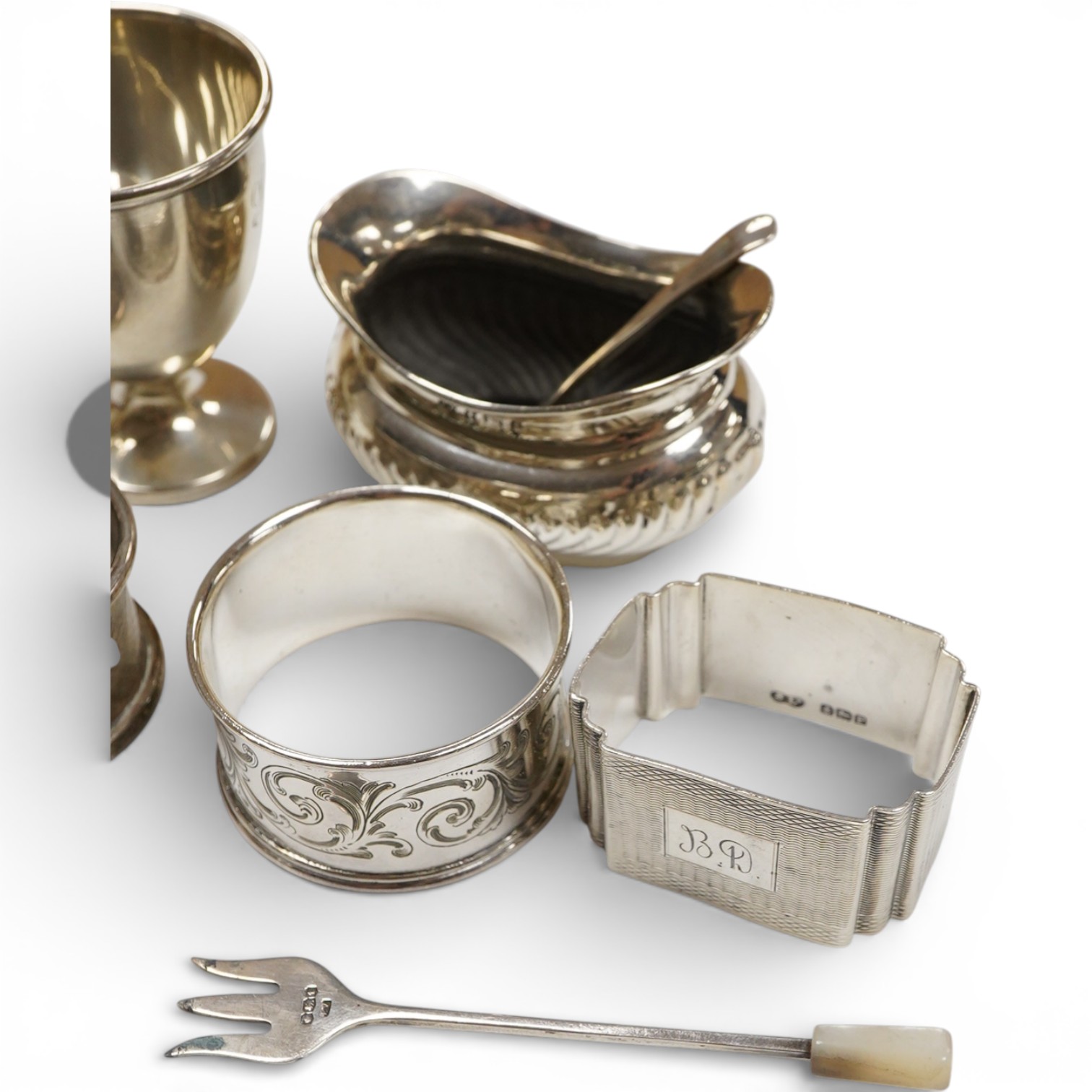 Lot 844 , Three silver condiments including a pair of salts, Birmingham, 1903, with two spoons, six assorted silver napkin rings, a silver egg cup, a silver caddy spoon and a small silver pickle fork.