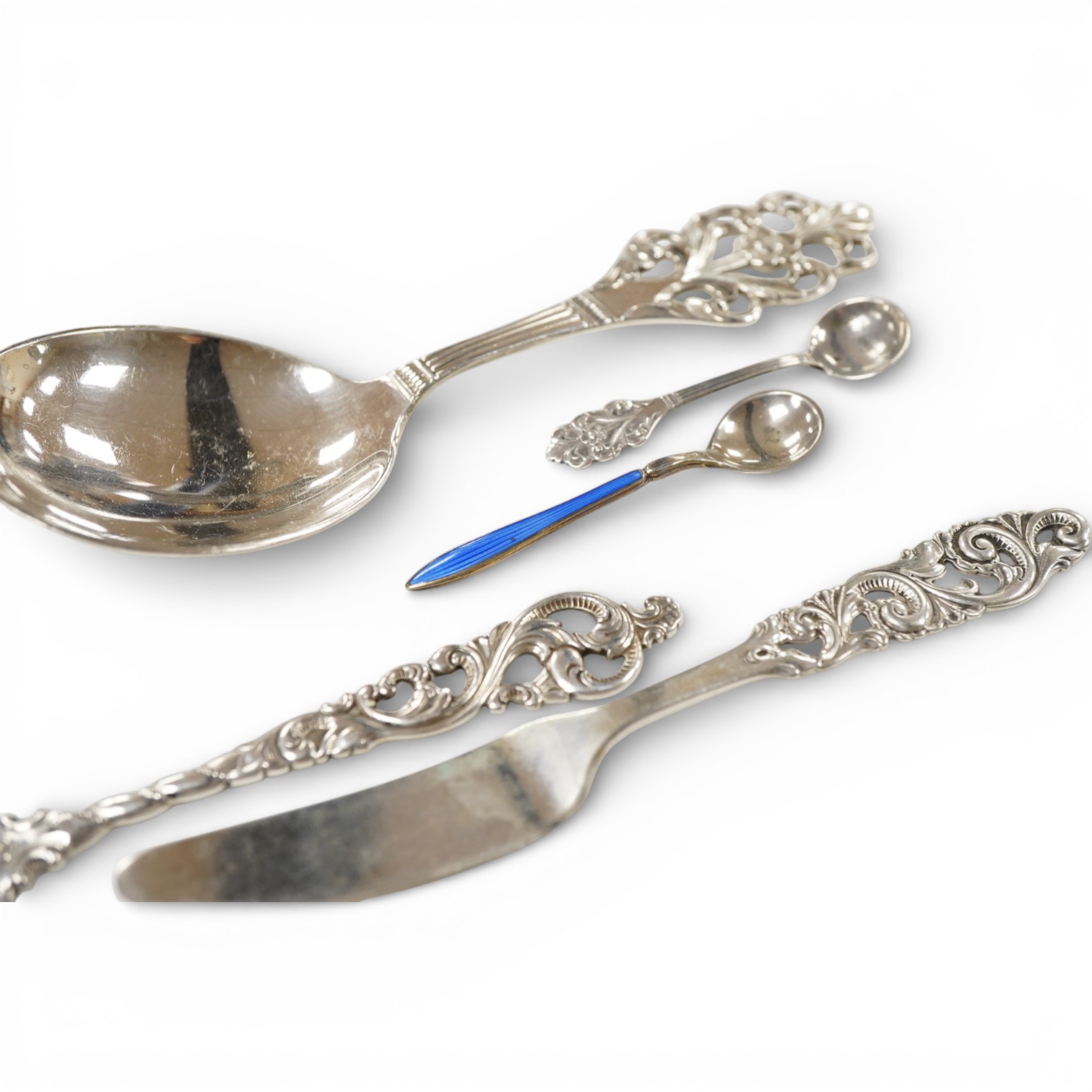 A Norwegian sterling and enamel mounted glass condiment and sundry other items of silver and white metal including spoons, boat salt etc.