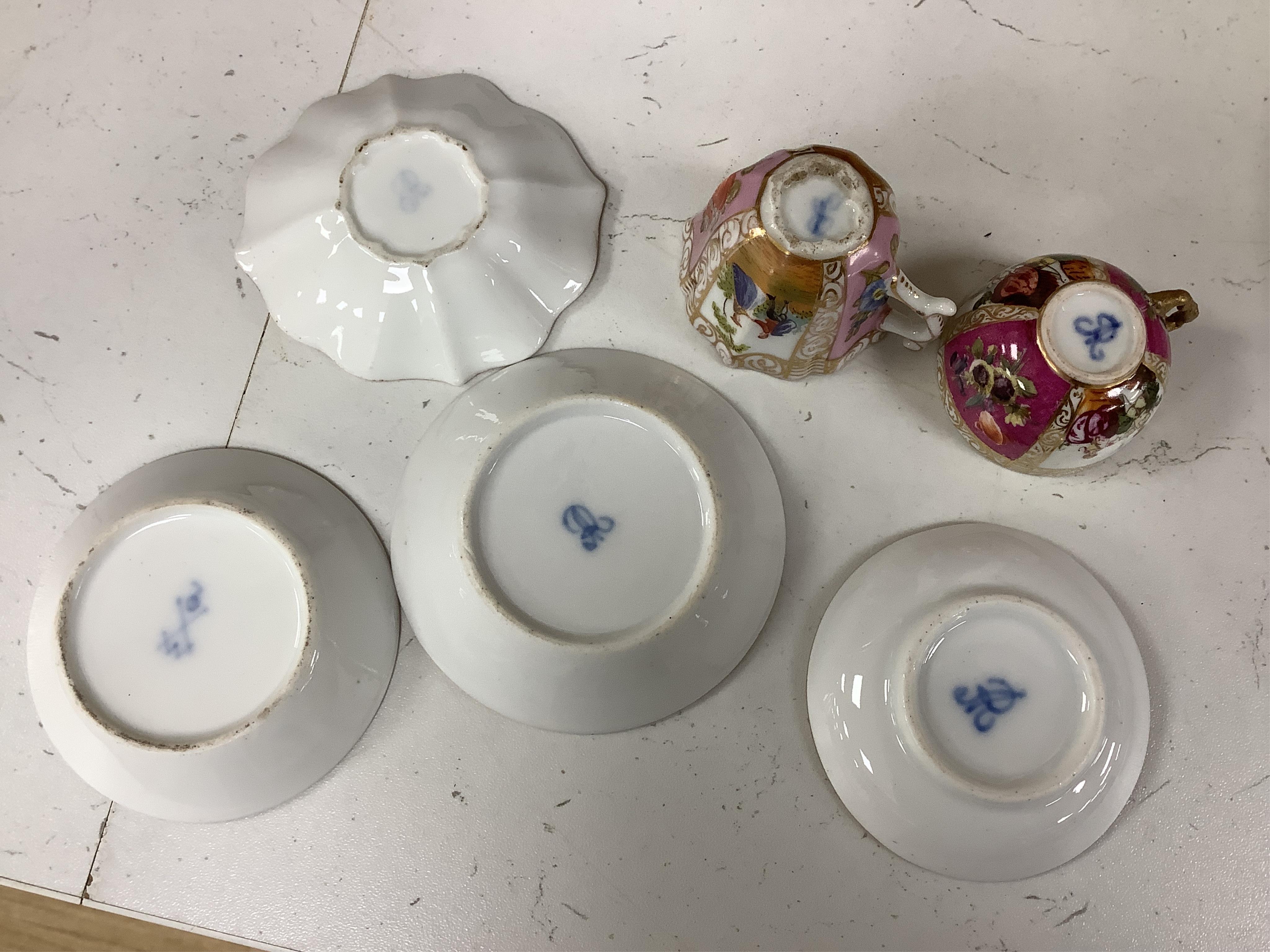 A collection of late 19th century Dresden Helena Wolfsohn decorated miniature cups and saucers and two Vienna style cabinet cups and saucers, largest cup 5cm high.