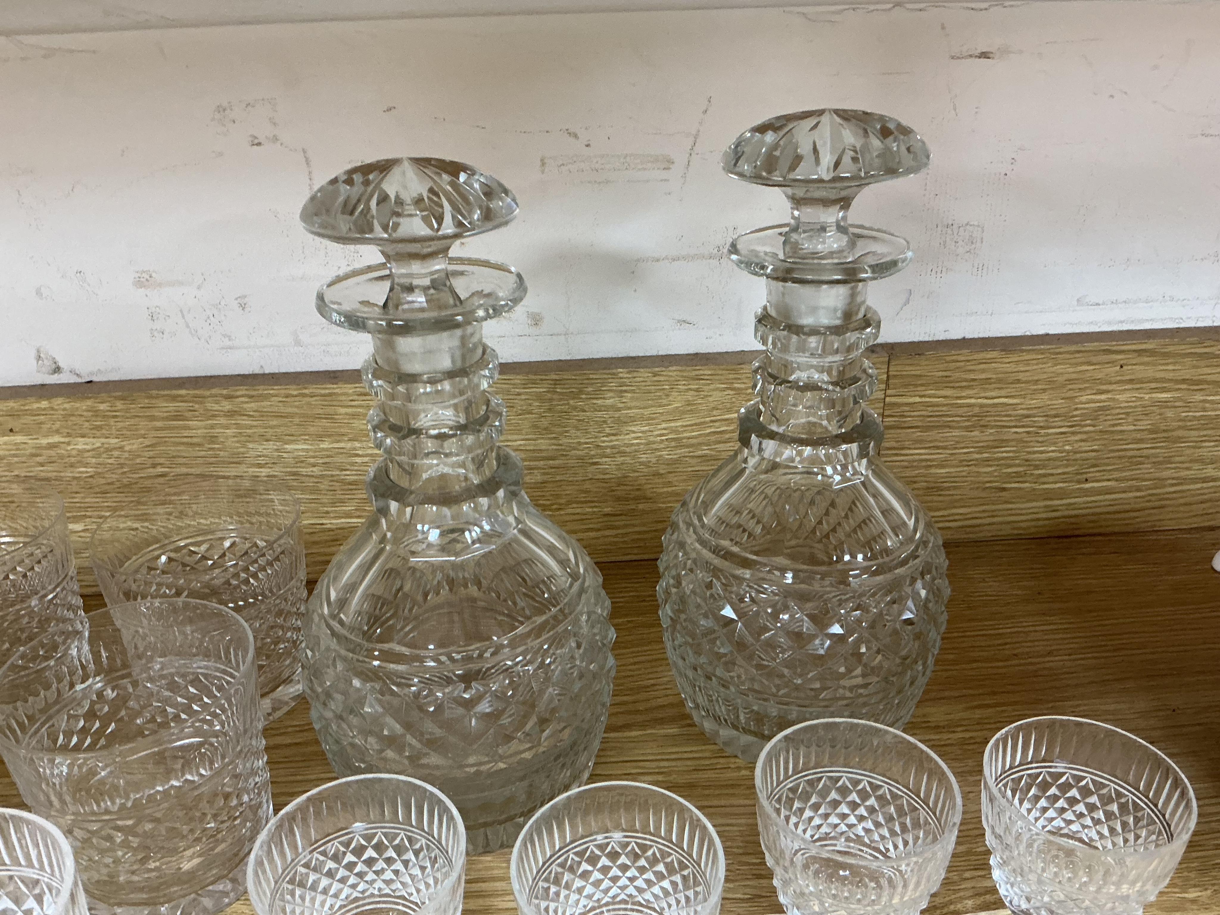 A pair of Georgian-style cut glass decanters with stoppers, and a part-suite of thirty-eight drinking glasses, decanters 27cm
