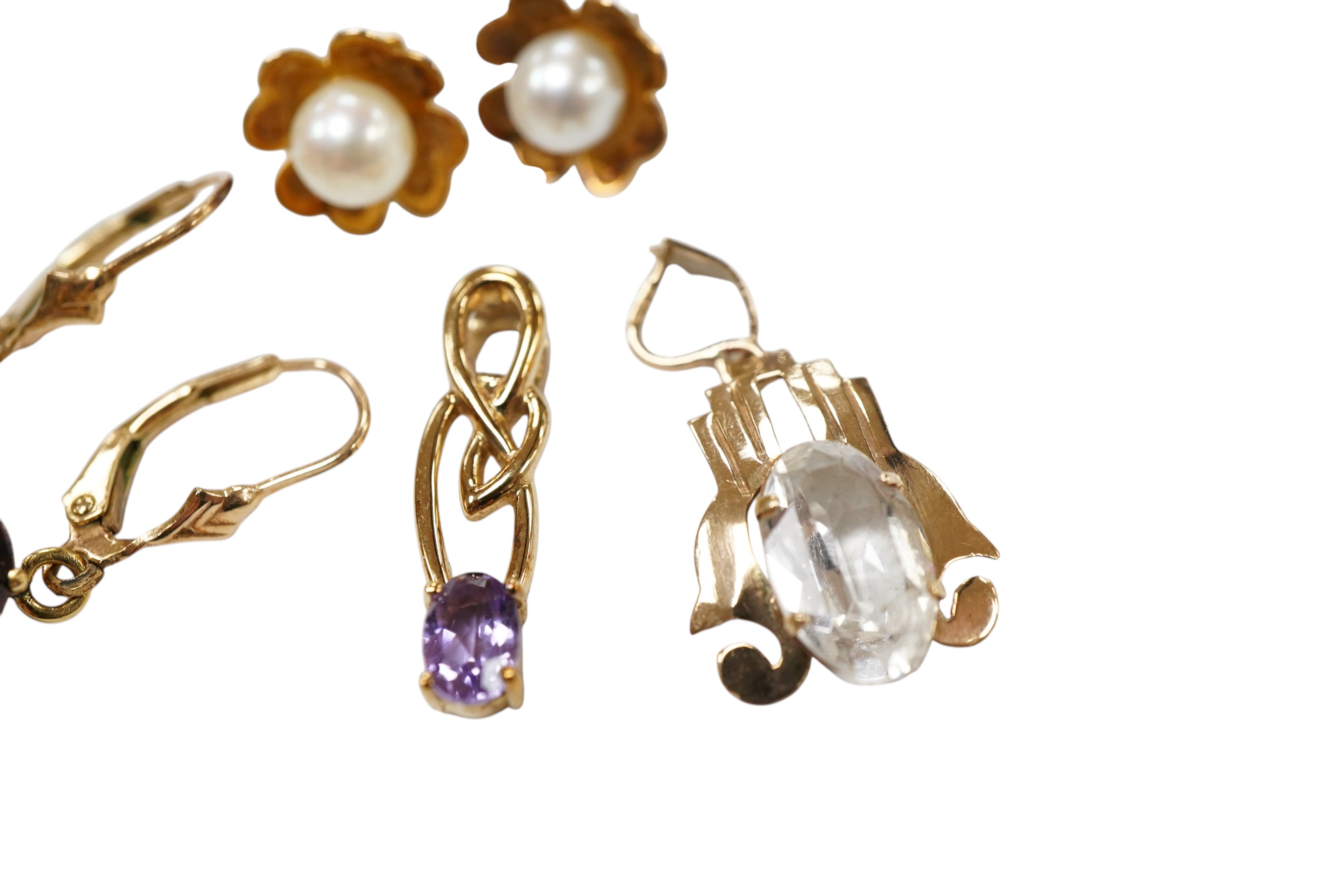Lot 1905 , Two pairs of modern 9ct gold and gem set earrings including garnet drop and single stone cultured pearl, together with two similar 9ct gold and gem set pendants including single stone amethyst.
